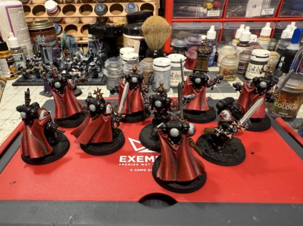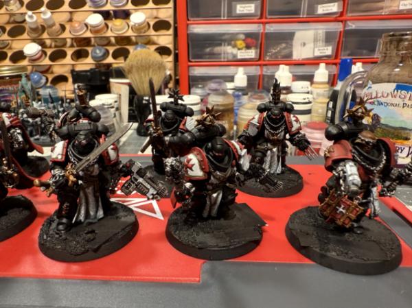 80% done I'd say. If I was really smashed for time, I'd finish their bases and call it a day. But I have the time, so I'll be adding another layer of grey-white, then red highlights, then the black highlights with incubi darkness. I've brought two minis up to white scar white level of shoulder pads, and honestly, it looks super chalky and I'm not very happy with it. So instead I'll probably stay with the Corax white level (which is the next step to do).
