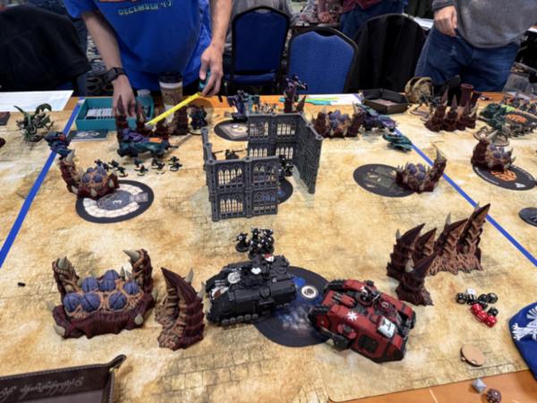 Here you see Helbrect getting ready to wipe out a big squad. Game swung back and forth over several turns, ending with just Snikrot and 8 gretch alive, plus (as usual for the stars of the entire tournament) the regular intercessors and the landraider. The raider took zero wounds all game, but my intercessors were down to just two models and the last ones left to hold down any objectives. A tight game, but a loss at 73-68.