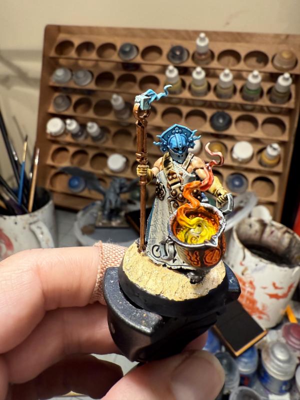 Going for bright skin, dark armor. Will likely work the metal armor up to sycorax bronze, then agrax and nuln oil it right back down.