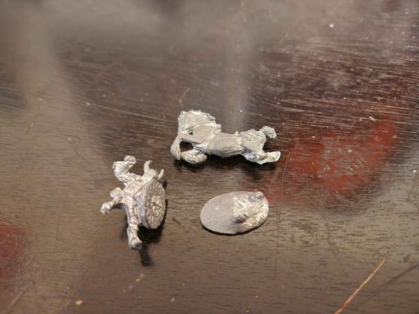 The stamp on the bottom of the feet read "Ral Partha 1975" but I couldn't find a horse with a tied up tail looking through the catalogs ? Also when I made new legs they barely lined up anyways! So for all intents and purposes this is my first old school kitbash