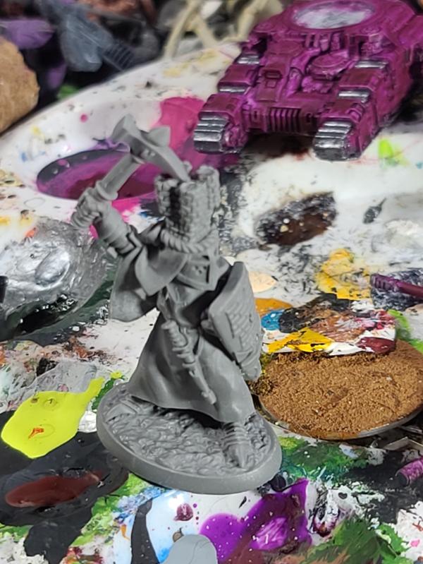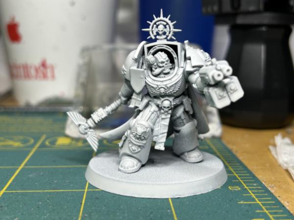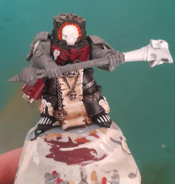 I managed to make a mace for him with the top part of a stormcast eternal guys hammer and stuck a couple skulls on for good measure along with a bolt gun to keep him "legit" for game's in the future (if I ever get one). Trying to give him a red glow behind his helm but will have to see how that goes.