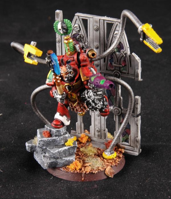 As to what I did to the figure... pretty much touched up everything except the power axe. Even the arms, which were just grey, are now metallic... even though you can't see the difference in the pic. Armor, flesh, details, badges, clamps, skulls, laurels... they've all been modified considerably. Not sure if the end result was worth the time, but at least I can say it's done.