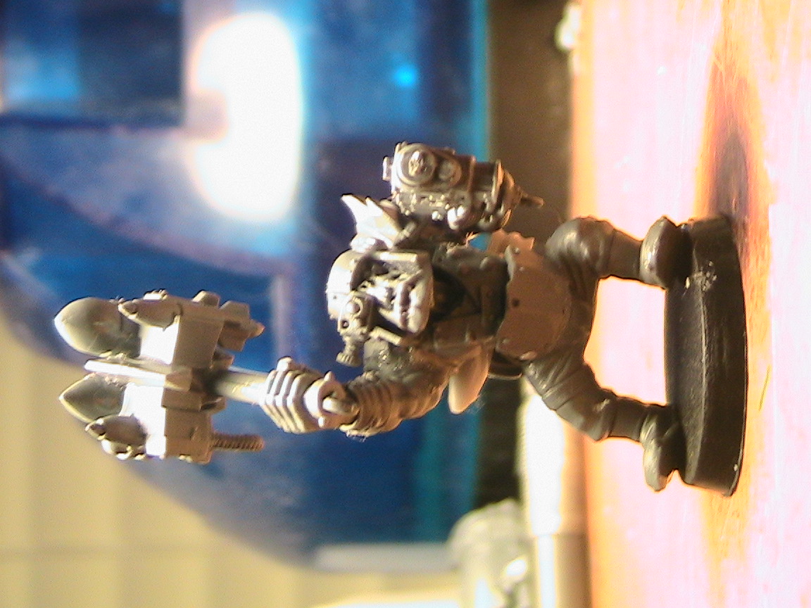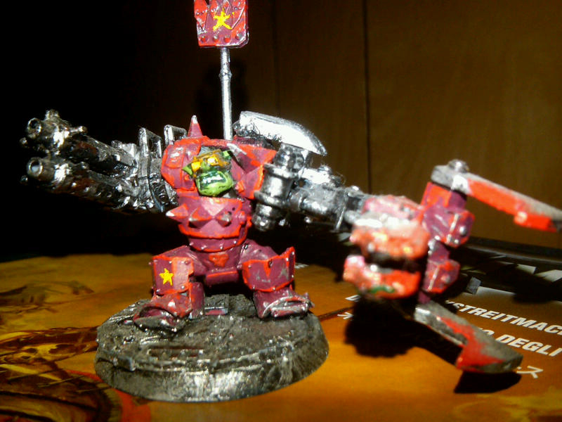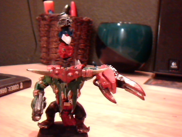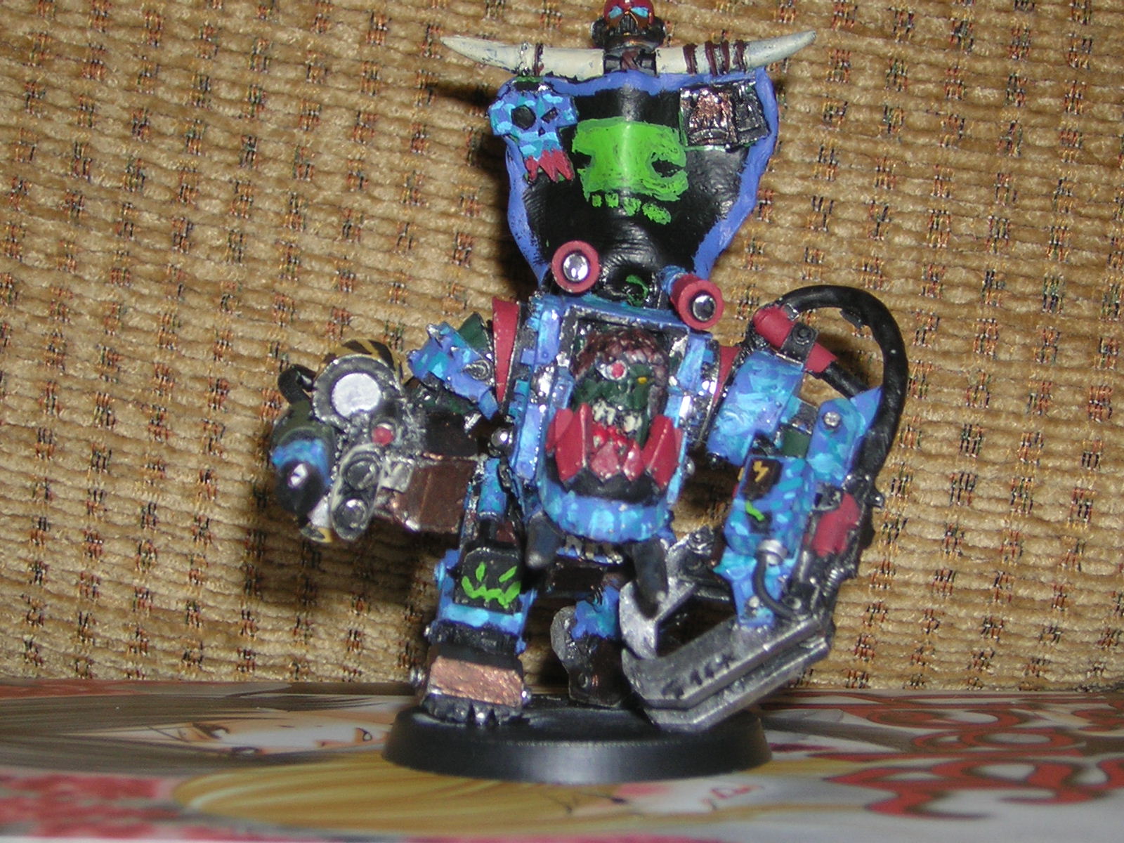 The Arm with the power klaw on it came from the hydraulic peice that broke off of my wartrukk's wrecking ball. and the right arm is 2 big guns cut off, and doubled up together. with two tankbusta mines glued together as the pivot point. And the entire rest of the body is a nob with strategically glued shoulder plates... lots of shoulder plates. the head/torso of the grot is from the warbiker grot that's hanging on the pole.