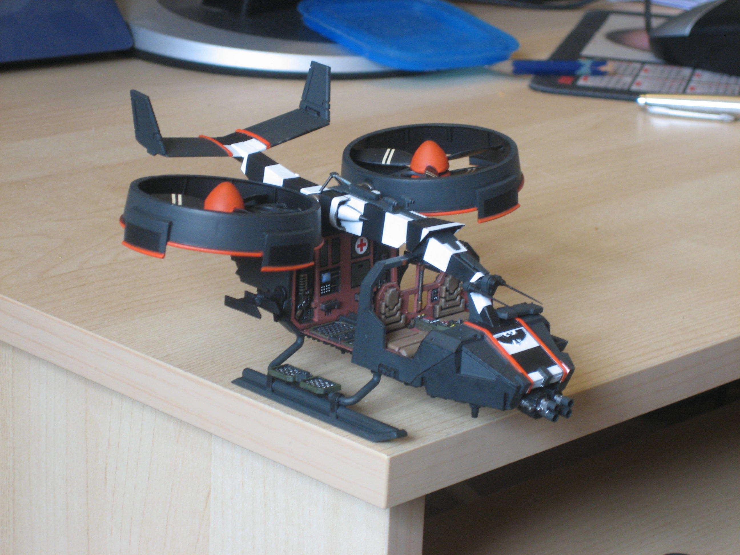 Well, usually the last model is the best model, so I would like to share my "CHARON" space (c)hopper - it's loosely based on a UH-1 Huey, but 40K'ed and based as a "pave low" version on my ATHENA airship:
