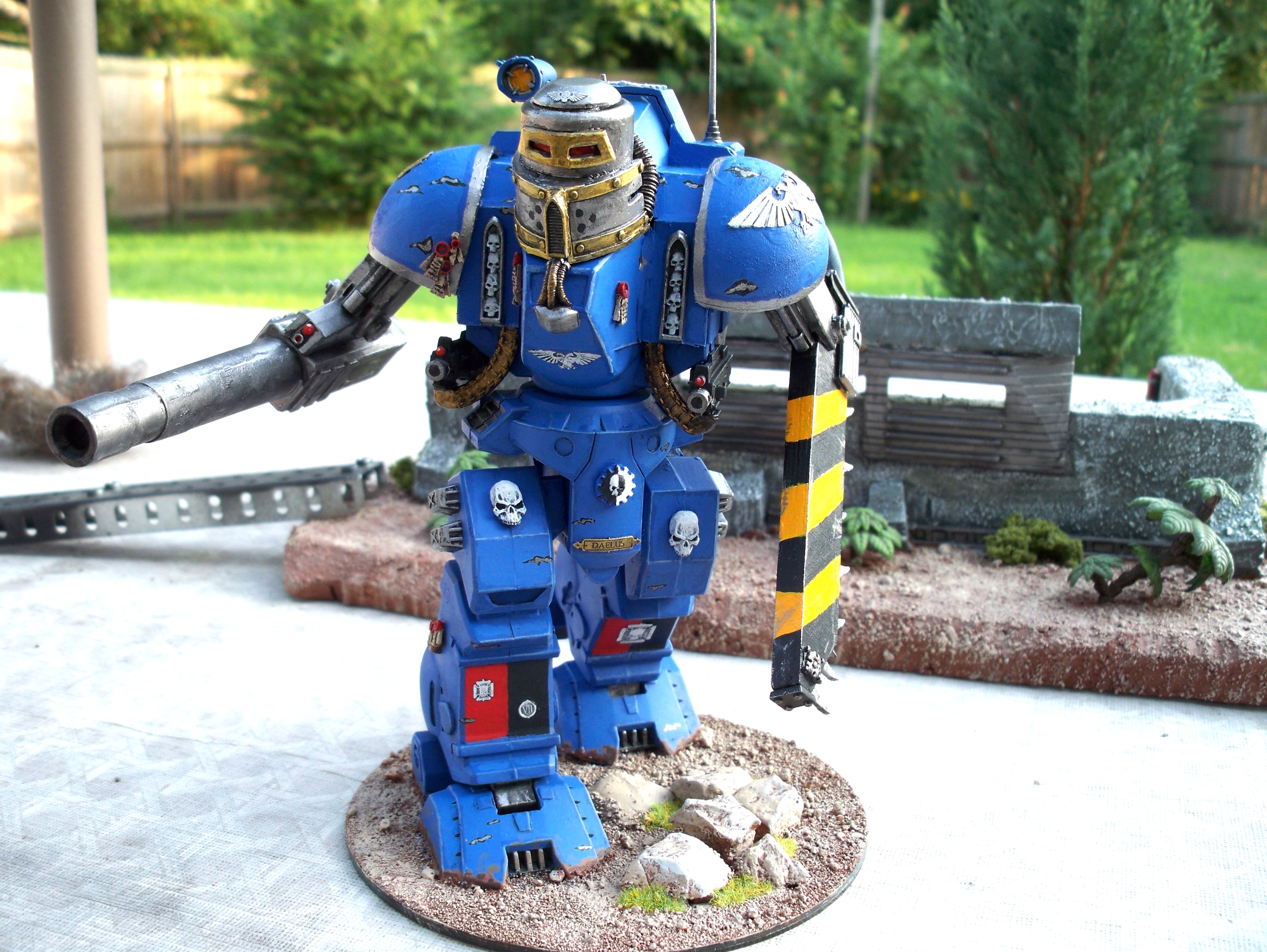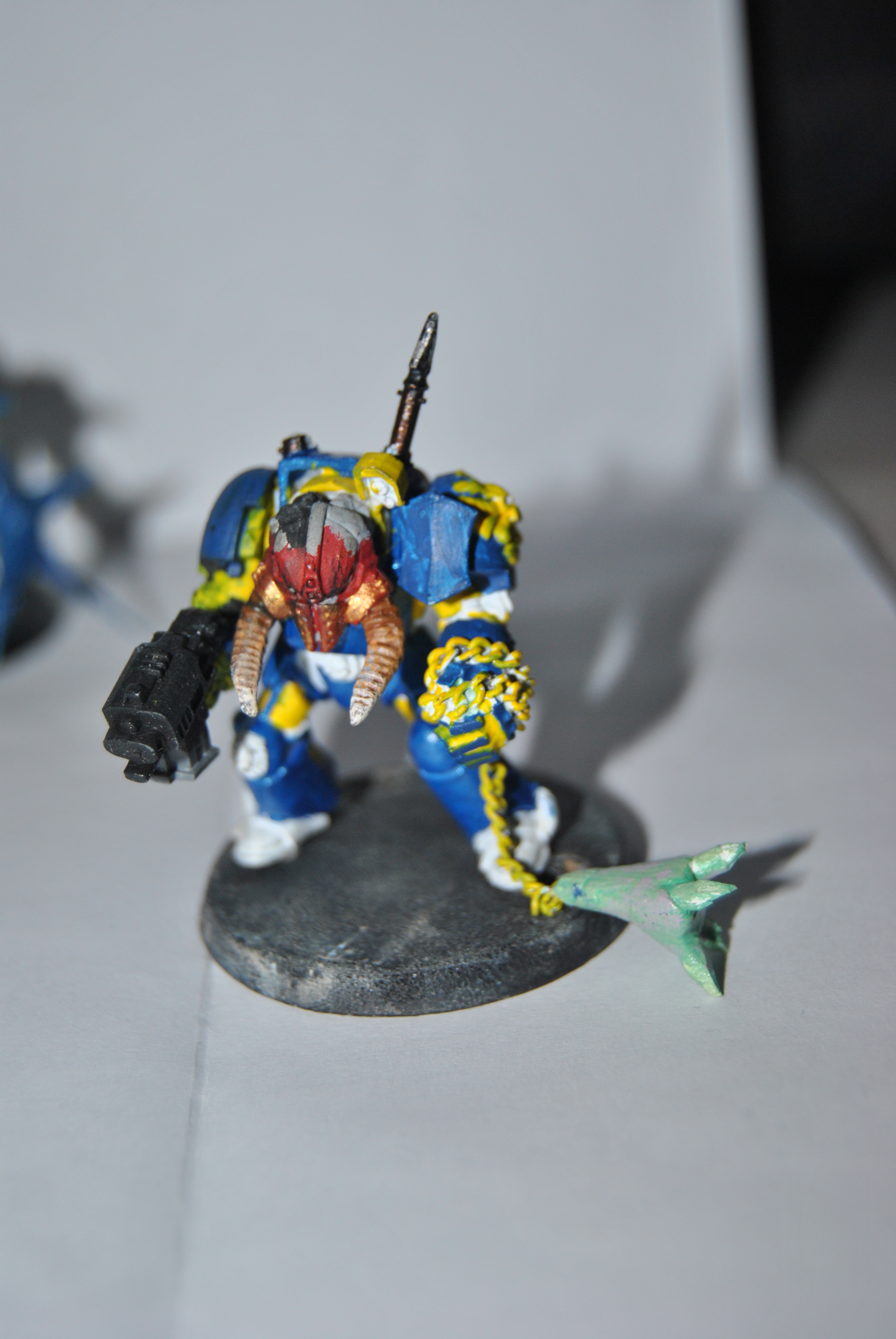 I present my by far most heavily converted unit, and my favorite. I present my true scale Ultramarine Chapter Master Kaesar II (bear with a different train of history). A bunch of stuff went into him- Calgar's termy legs, terminator arms, paperclip (for foundations), and a lot of greenstuff.