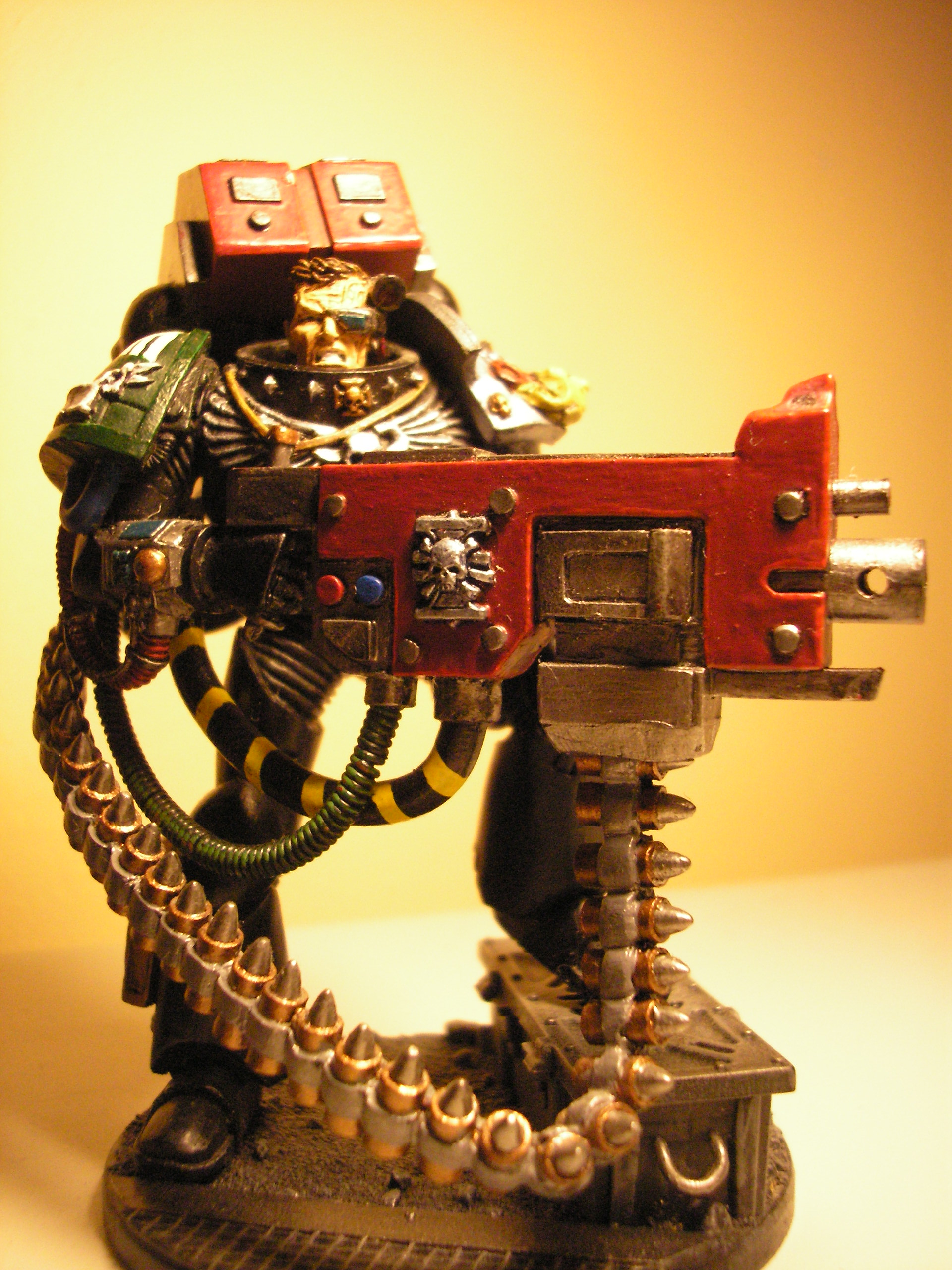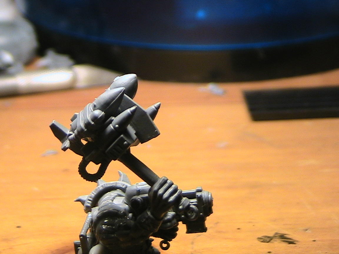 scratchbuilt heavy bolter from brass tube, greenstuff, plasticard, various wire for the cables.