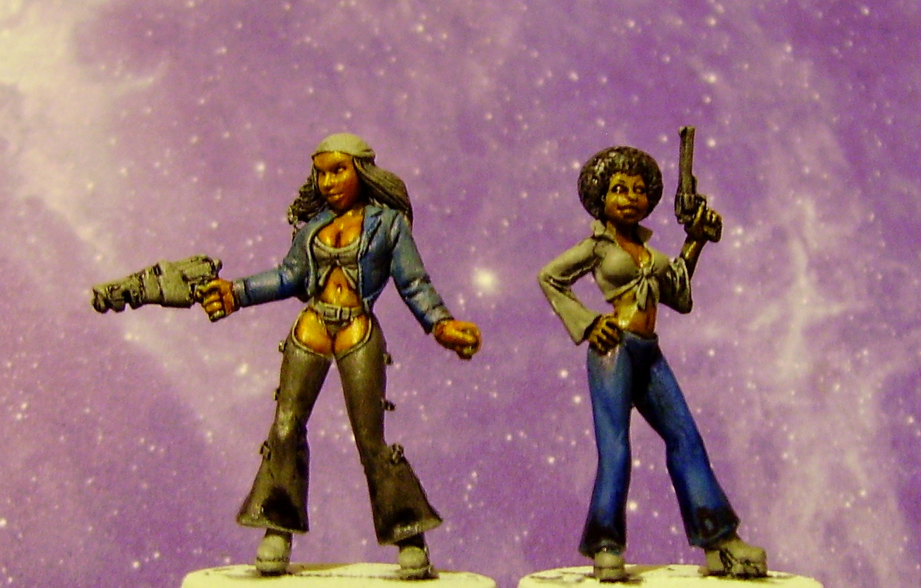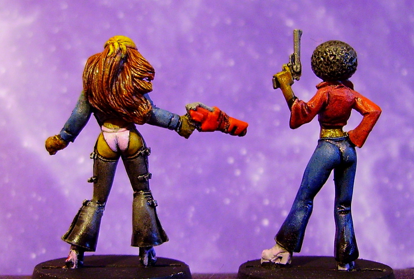 here are the finished girls. They look great if you ask me. Their platforms and long legs mean they are just a tad taller than the gangers but they still look good. Also finished warhammer mugs for your contemplation.