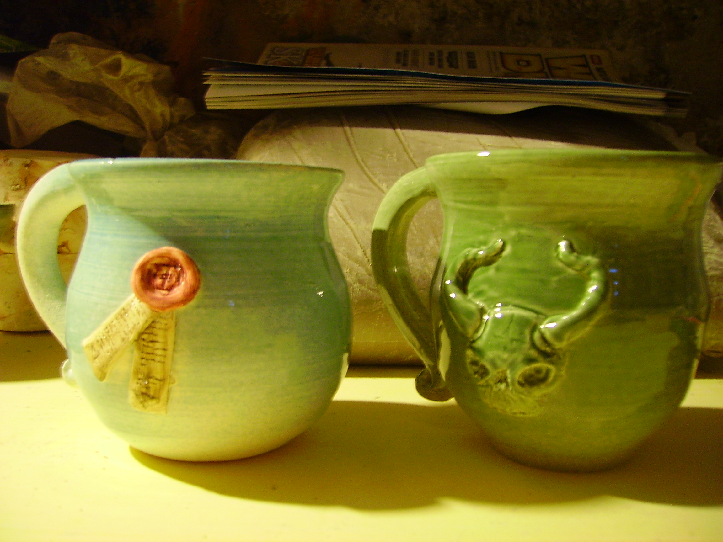 Heres mugs. I have to confess that I found a few bare patches on em so I added more glaze and put them back in the kiln - hopefully this will work... Results tomorrow evening
