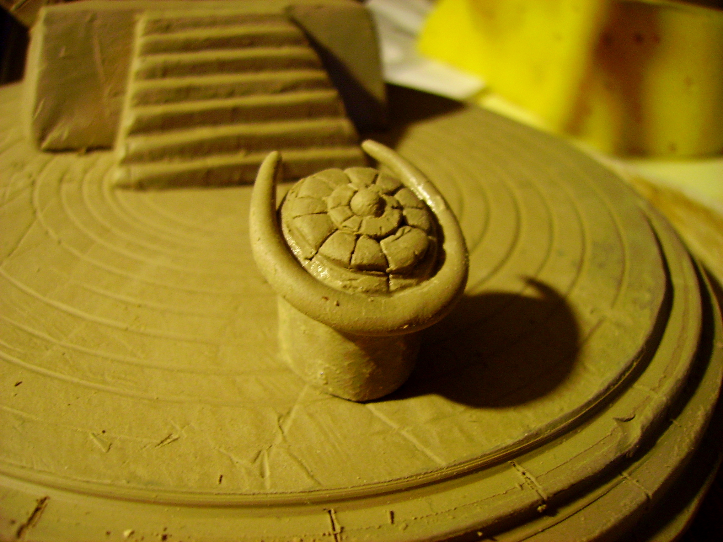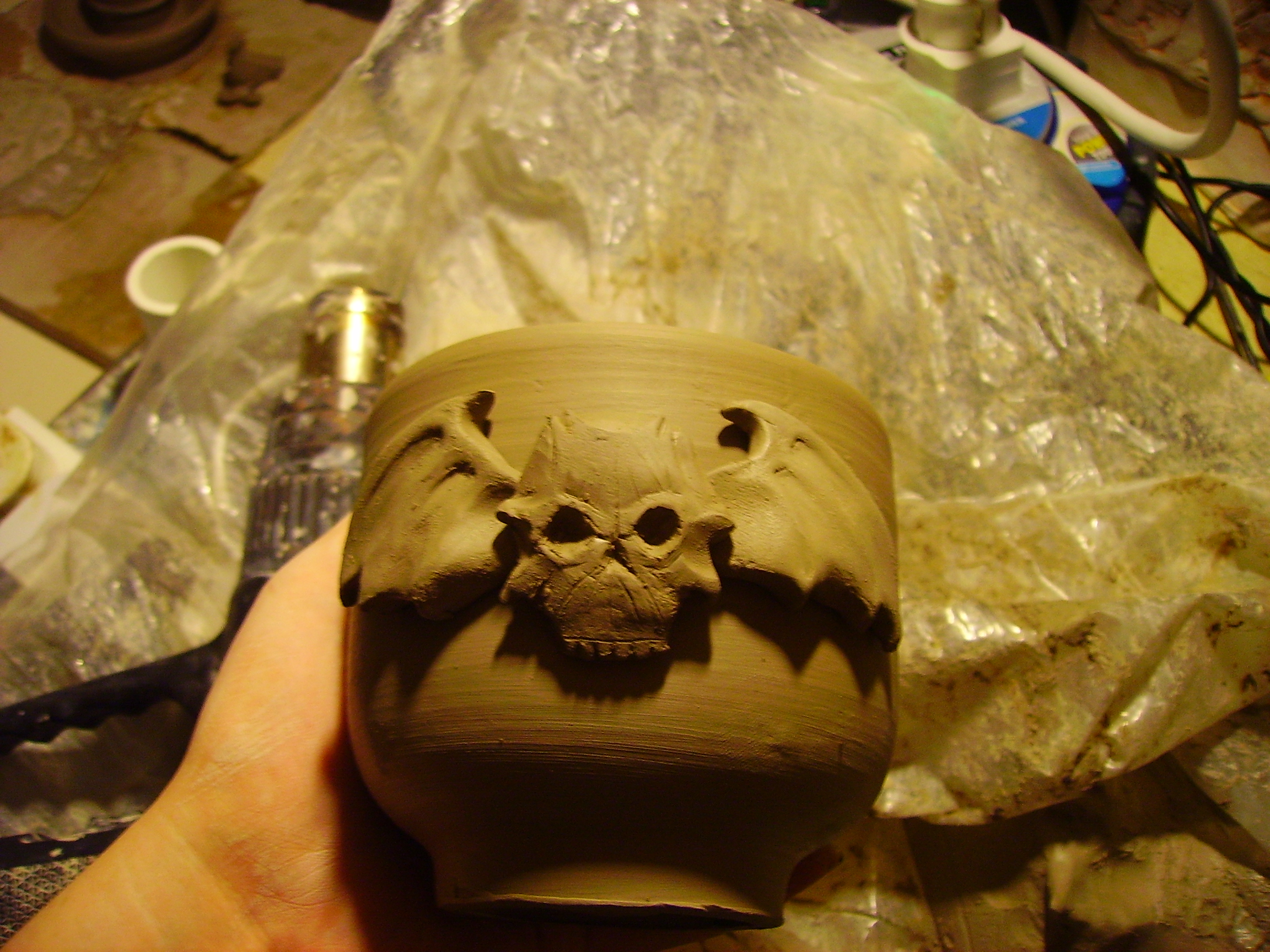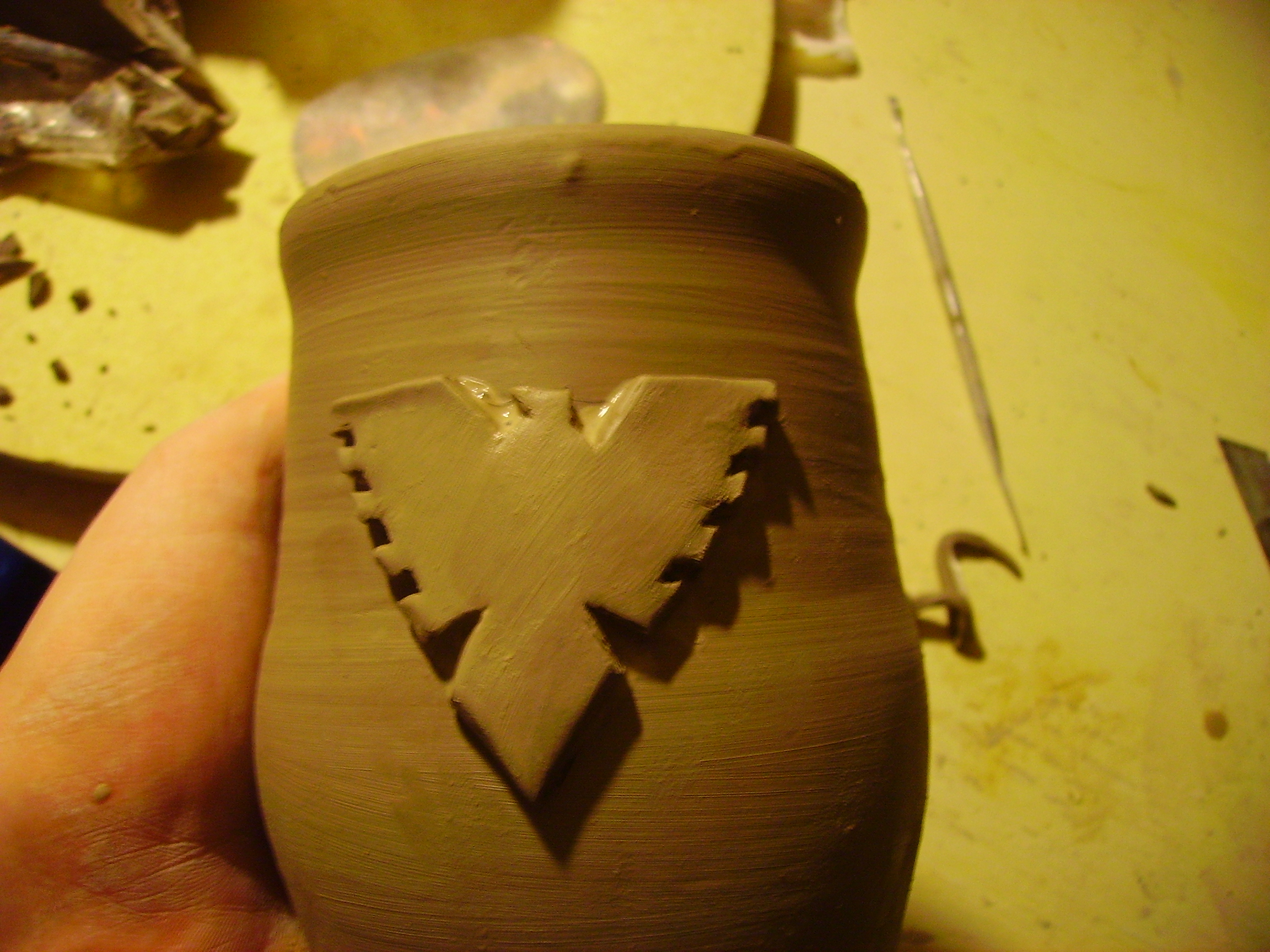 But let me conrtinue my rant... in a way the sculpture on the mugs is a mere icing on the cake. The process of making the mugs is a work of perfection guaranteed to sap my strength, learning to throw pottery on a wheel is somthing akin to learning to drive, especially seeing as you have an excellerator pedal... took me three months to get any kind of pot and I am still learning and will continue to learn for the rest of forever. Then once the pot is dry enough to stand it you flip it over and turn the base in the manner of turning on a lathe, this is a matter of presice presicion, delicate beyond belief or you will end up witha squashed pot. Then finally we come to the sculpt... I would love to spend longer and harder work on the sculpt but I can only do so much as this is in fact the hardest bit and I sometimes wonder where to begin but somehow it comes together. Sorry von dom you touched a nerve and I just thought I should point out that its not like green stuff. any concrete thoughts on exactly how you want the symbol to look as I have just one chance to change it tomorrow and then I will have to start again cos it will be dry.
