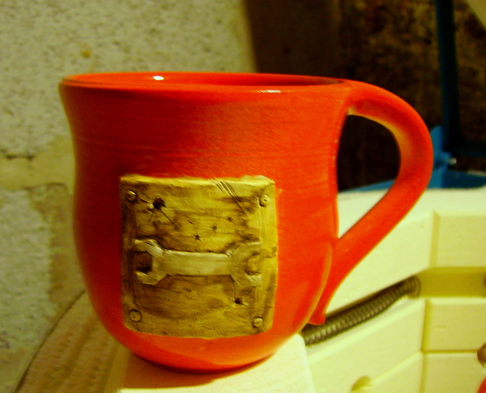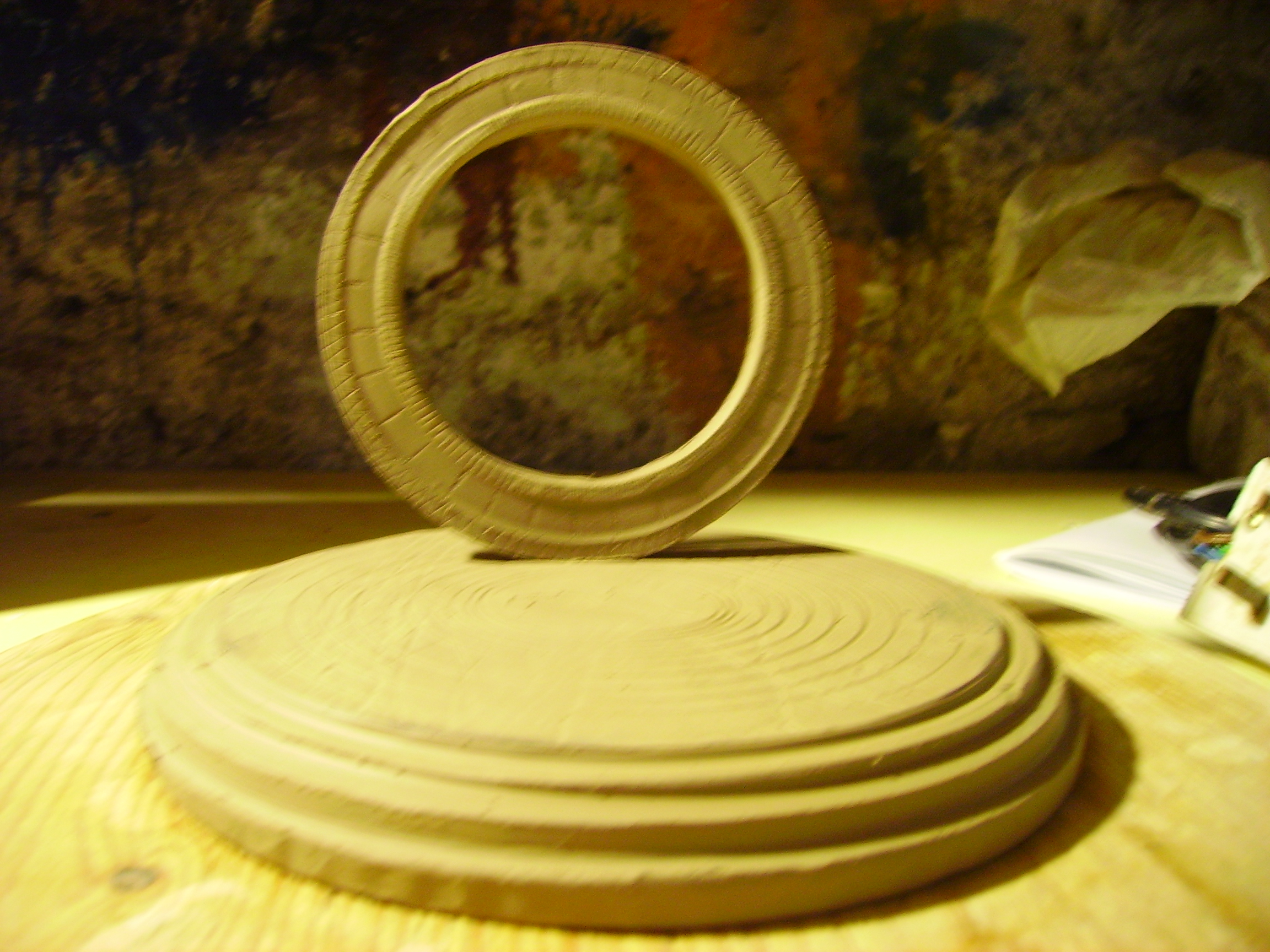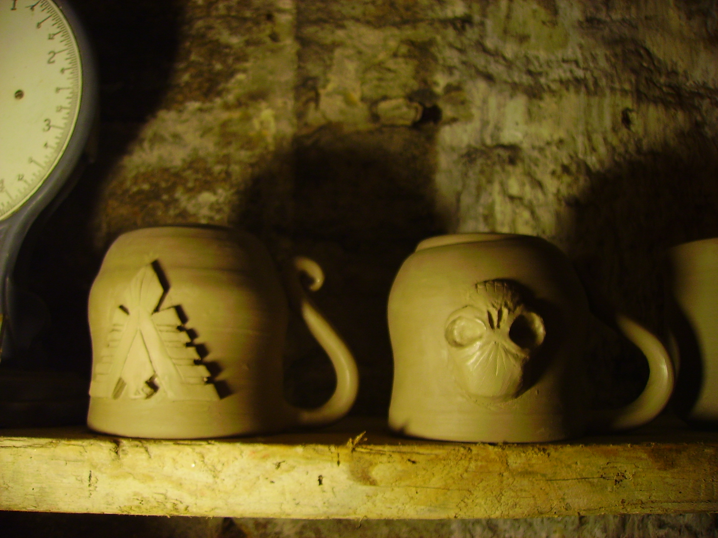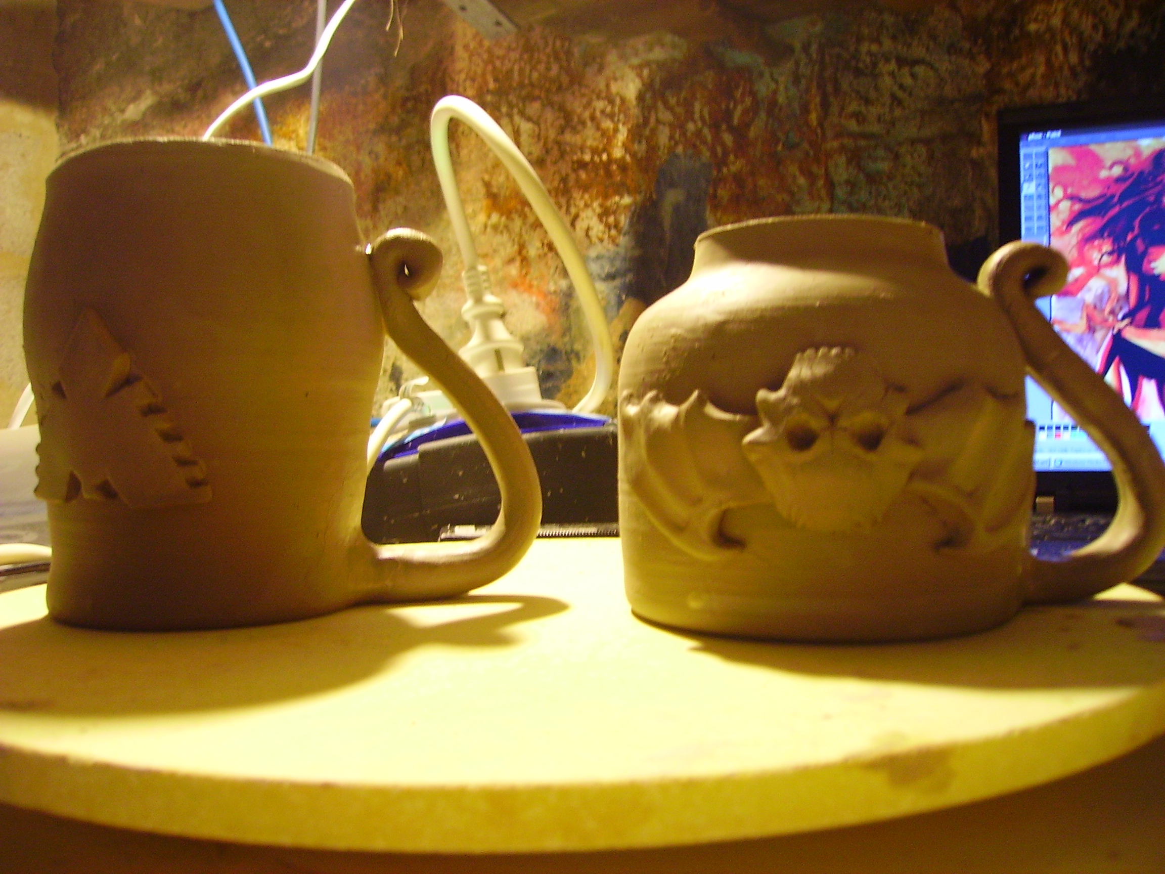 But let me conrtinue my rant... in a way the sculpture on the mugs is a mere icing on the cake. The process of making the mugs is a work of perfection guaranteed to sap my strength, learning to throw pottery on a wheel is somthing akin to learning to drive, especially seeing as you have an excellerator pedal... took me three months to get any kind of pot and I am still learning and will continue to learn for the rest of forever. Then once the pot is dry enough to stand it you flip it over and turn the base in the manner of turning on a lathe, this is a matter of presice presicion, delicate beyond belief or you will end up witha squashed pot. Then finally we come to the sculpt... I would love to spend longer and harder work on the sculpt but I can only do so much as this is in fact the hardest bit and I sometimes wonder where to begin but somehow it comes together. Sorry von dom you touched a nerve and I just thought I should point out that its not like green stuff. any concrete thoughts on exactly how you want the symbol to look as I have just one chance to change it tomorrow and then I will have to start again cos it will be dry.