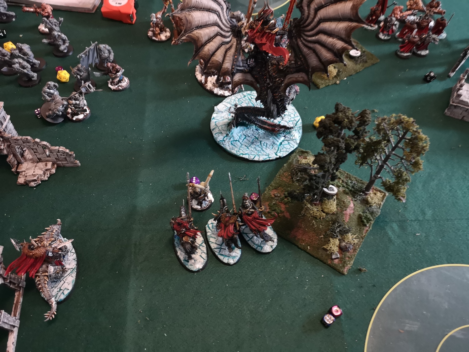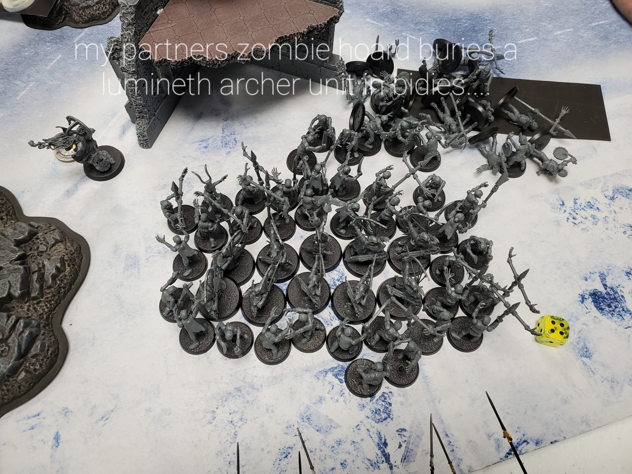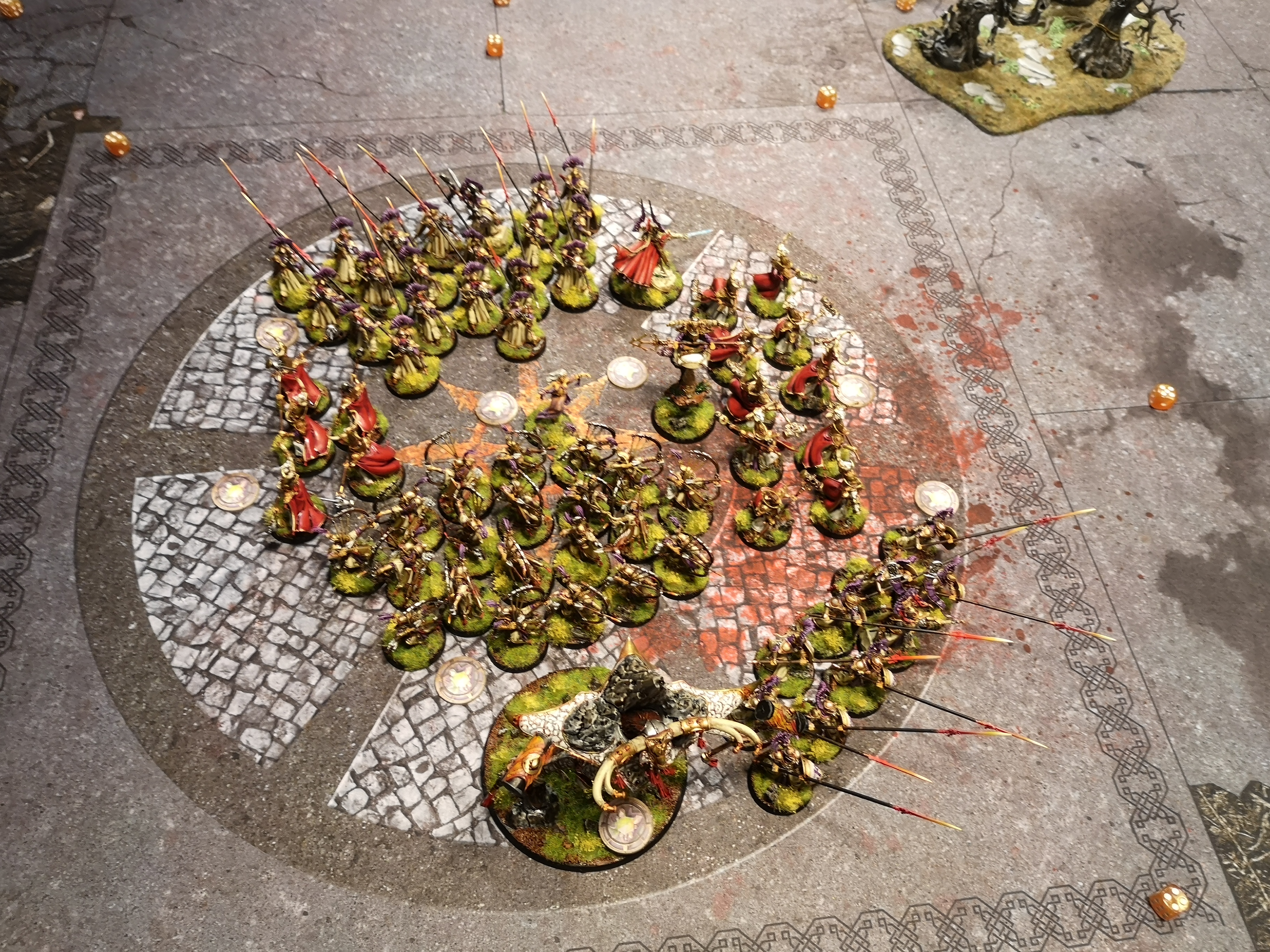 Situation in pic didn't end up that badly. Neferakh(?) Dealt with 7 pikes but took 8 wounds in return. Big block lost like 6 or 7 but caused 11 in return(if only i had the 5+ mw spell on....). He gained 2 back for both. On his turn i nearly killed the named hero on zombie dragon when he cast mw on 5+ to all within 12". Didn't bother to dispel and instead for for every my unit on 4+ spell ignored and i cause d3 mw. Ended up 1 short...lol. he caused no mw, i caused 4.