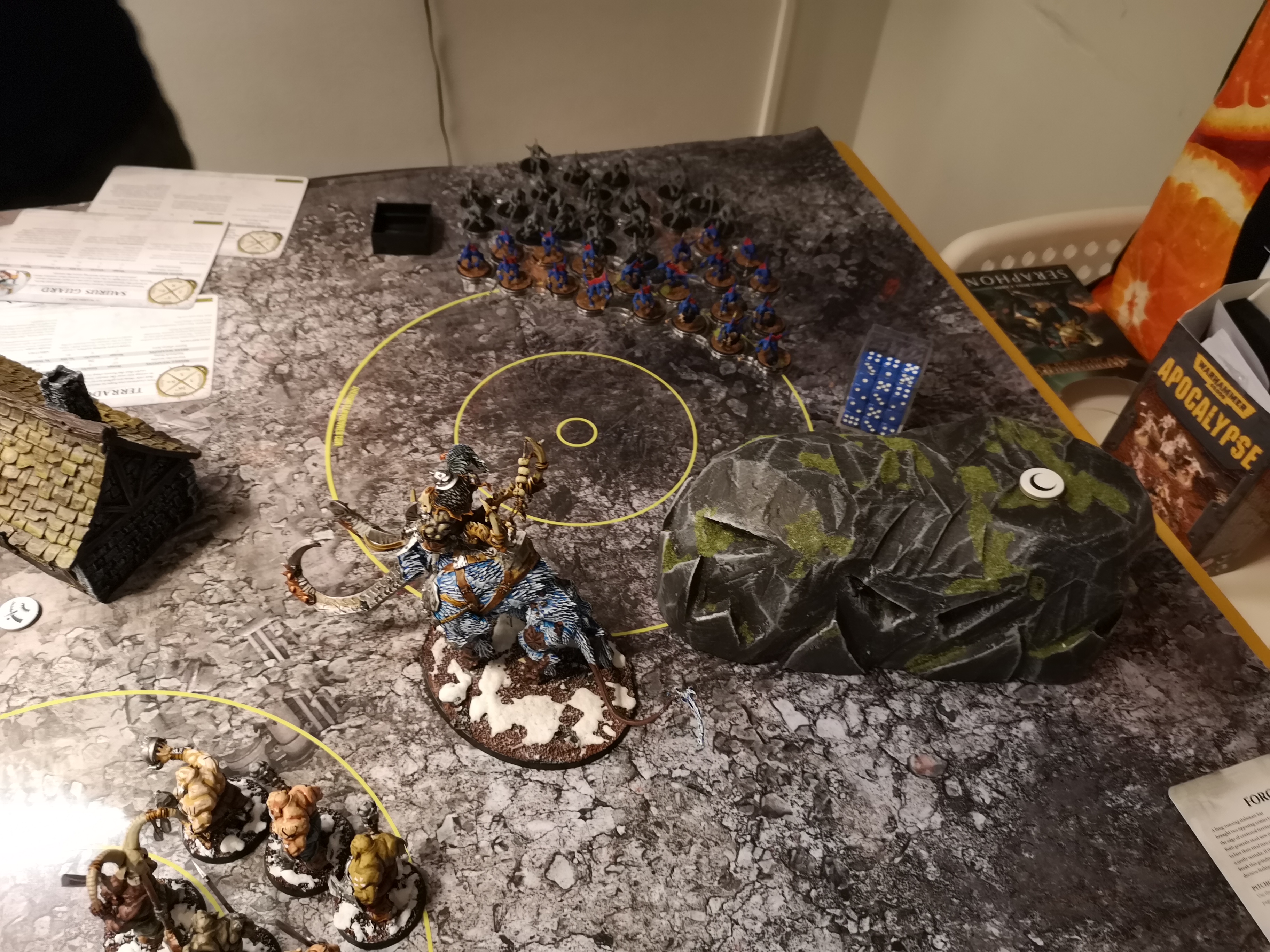 2 more games. Seraphon vs ogre. Went to melee too gung-ho, ogres counting as 2 and last turn shooting failing to kill 3 gluttons not even 1...) meant he would win 20-18 at best.
