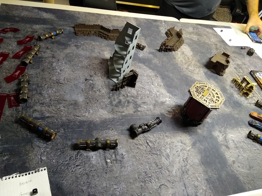 1750 points of Favilla's hyper-aggressive Ferrox pain-train took on a two-player Krytos / Fureans alliance, facing off on a desert world tainted by a foul, toxic atmosphere (which could worsen critical damage over time) and wracked by a painful, daemonic presence (which made machine spirits even more unruly than usual). Both sides were trying to break deeply into the other's lines.