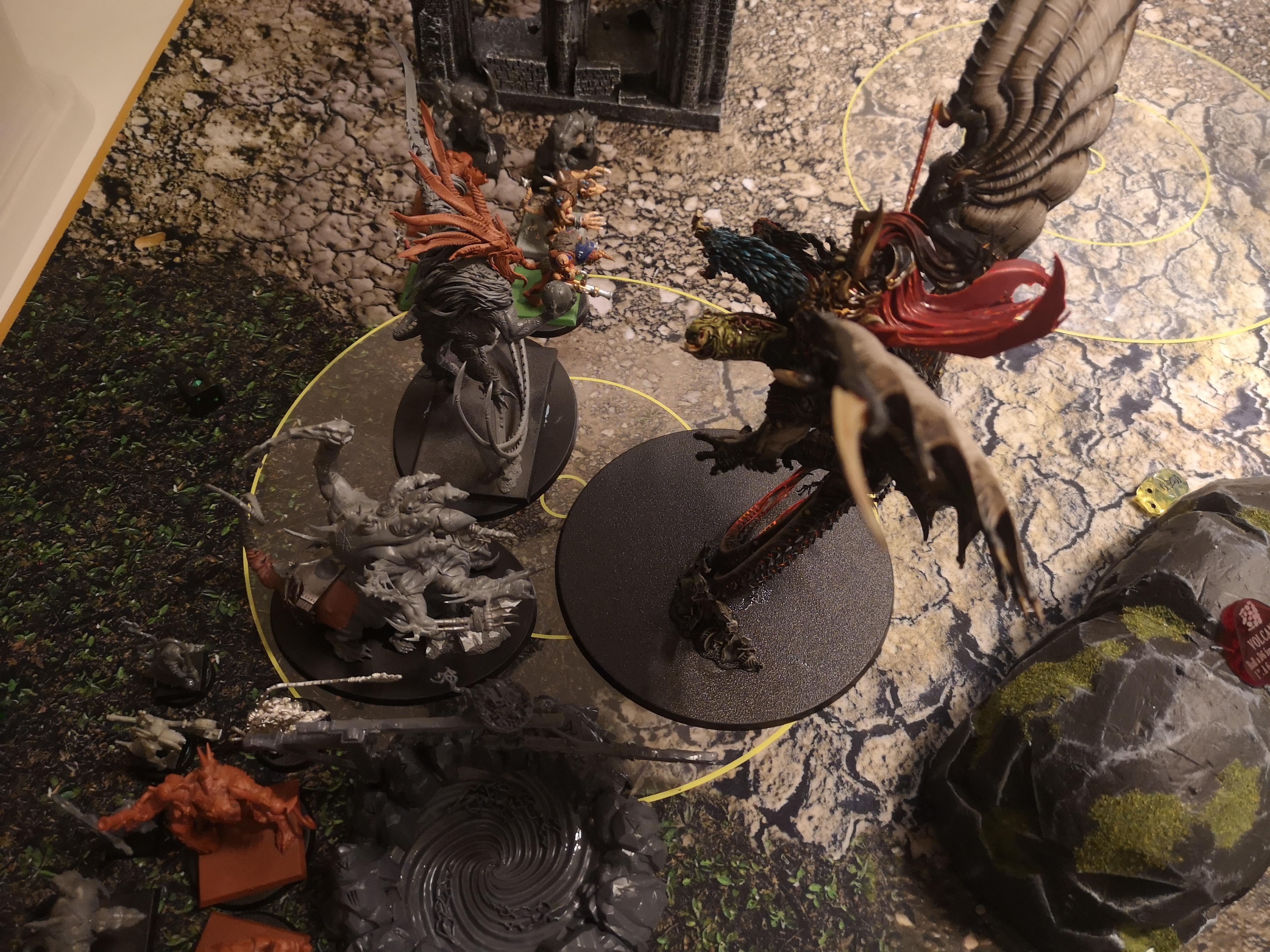 21-21 tie all monster seraphon vs slaves to darkness(places of arcane power) . Total massacre casualty wise(3w left sorcerer lord on manticore sole survivor vs 6 surviving lizards) but objectives is how you win. Odds were on my favour after t2 double but he did what needed to be done and kept winning chances all the way to t4. And got enough to tie up.