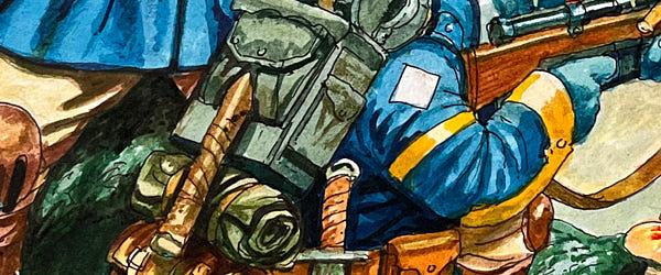 The row of six pouches across the belly also seems pretty specific and I'm sure I've seen it before but I can't remember where. Most rigs like that have five pouches or a buckle splitting two blocks of three. Could maybe be something intended as a bandolier worn in an unconventional way?
