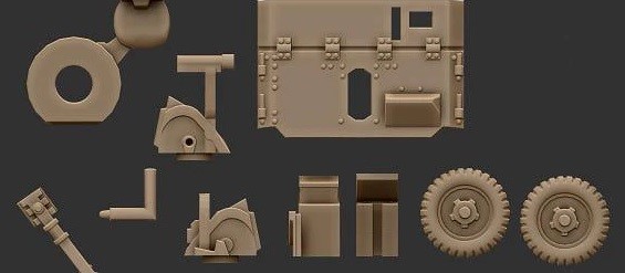 Looks like some heavy support for the bulldogs, although it seems to me that steampunk power cell would be tricky to injection-mould, so maybe a digital release. Depending on exactly how cutting moulds works, those wheels could be a problem too, but it does seem physically possible to cast them with two faces; you just need your mould line to follow a zig-zag.