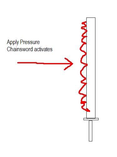 Hordicant wrote:The really awesome thing about the concept of a chainsword is it strips out any physics involved and throws it out the window for cool-factor. If anyone has ever used a chainsaw in real life you know us mortal men need to use 2 hands to keep it under control. Now imagine taking said chain saw and banging it against someone. Yes it will kill them, yes it will leave a bloody, gorey, stain, but its also gonna bite home and launch itself out of you grip as the spinning teeth grab purchase into their body. But what if the chainsword only runs or activates when pressure is applyed to the cutting edge this would conserver power and make it easier to weild