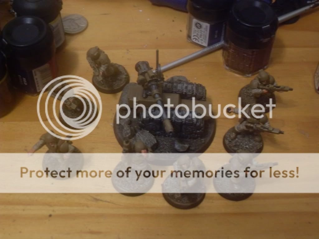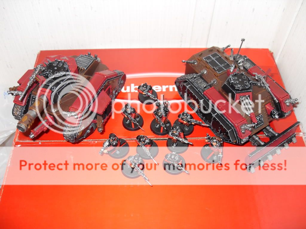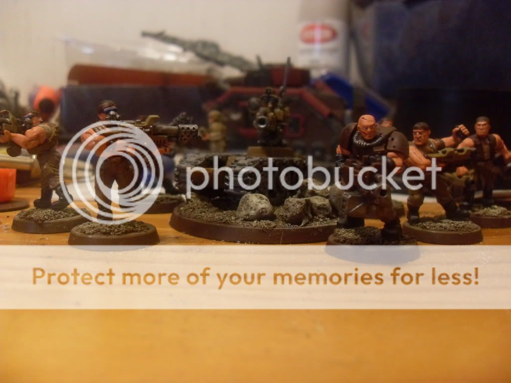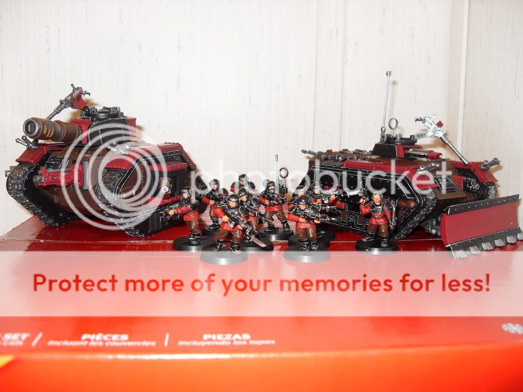 Since I've finally gotten my grubby mitts on a digital camera, I've decided to start a painting log that I'll endeavor to update twice a month as a means to keep me focused on getting as many well painted miniatures painted as my free time allows. Without further a due here's my latest completed works: Fully assembled and painted: 1 x 10 man squad of IG with Sergeant, Grenadier, and Vox Caster 1 Leman Russ Battle Tank with hull mounted Heavy Bolter, Heavy Bolter side sponsons, pintle mounted Heavy Stubber and Battle Cannon 1 Chimera with Multi-Las, hull mounted Heavy Bolter and pintle mounted Heavy Stubber Next up: 3 missile launcher heavy weapons teams 3 mortar heavy weapons teams 2 autocannon heavy weapons teams