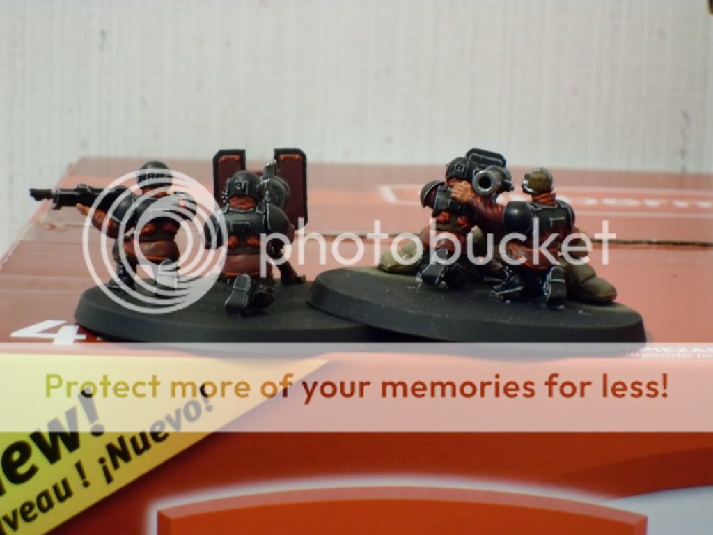 Actually, I'm painting them for a friend who's paying me in miniatures. The only thing he told me was that he did not want them in a camouflage pattern and that he thought red uniforms + black armor would look good. After a test miniature, I decided there needed to be a third color and tried to pick something that matched and was more unique than what most people used. Personally, I don't know much about the fluff for the army itself, but I would wager their colors are used similarly to Space Marine Chapters' bright colors in that their bright colors are to warn the enemy of their impending doom and that they'd rather their opponent see them coming as they're some type of feared shock troops. Although, I find the thought of "small, elite fighting force" as the anti-thesis to IG, but it's not my army so whatev.