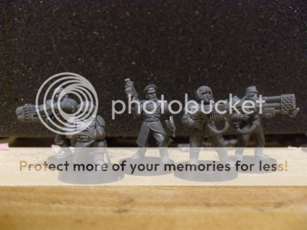 Just finished assembling my pal's Company Command Box Set. I do have to say that I'm partly impressed and partly disappointed in the kit. High points include lots of customizable bits for making up to a 5 man command in several configurations. Low points are the obvious cheapskating on GW's part in the design of their special weapons(the flamer is identical to the one from the infantry platoon box set and both the meltagun and plasmagun are direct copies of the space marine weapons just with an IG arm already attached and a small side peg added for the second arm to attach to). Also, it would have been nice if there was an option to NOT use the bionic arm if you wanted to equip a member with a power weapon, but oh well.. Anyways, here's some pics of what he wanted assembled: