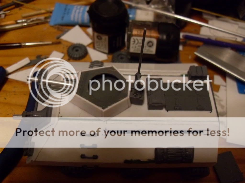 First off, I replaced the circa WWI wrap around tank tracks with something more modern. Then, I filed off all of the pointless rivets, because as far as I know the Imperium hasn't forgotten how to weld. Also, I raised the side armor up a bit to provide some ground clearance on the road wheels, which are now exposed as well. In addition, I hacked off a lot of the excess side armor. I scored the plasticard at regular intervals to look like easy to replace armor paneling, whether the effect came off as desired, I think I'll have to wait until I paint it to be sure. Another change was that I cut down the gun platform and lowered it into the hull of the vehicle to reduce it's profile. I had intended to enclose the hull around the gun, but given the IG rules, I figured it would cause confusion over whether it had an enclosed crew compartment... I may still add one.