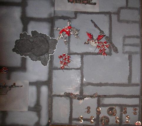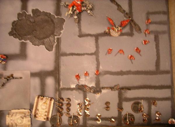 The platoon command chimera tries to drive through the wreckage to shield their commander but the tank is immobilized instead. One of the Valkyries shows up and between the shooting from the artillery and the valkyrie the full squad of bloodletters is knocked down to 3. Panic fills all vox channels as the enemy appears all around them (shep gets boxcars on his first order). The daemon prince is banished back to the warp. The last bloodletter is dragged down by the guardsmen after claiming another skull. The guardsmen spread out to protect their commander like human shields. Shooting against the bloodthirster is largely ineffective thanks to armor saves and the guardsmen needing a 6 to wound with the lasguns.