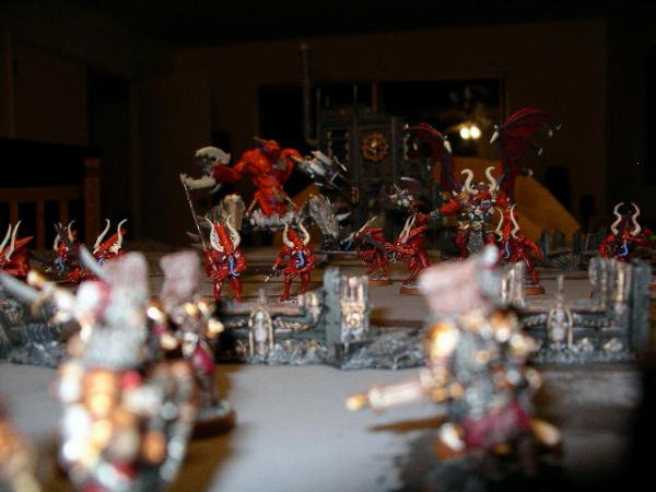 We rolled up the mission and ended up with an objective in each of our deployment zones and dawn of war deployment. I put mine in a building on my right side, Shep put his in the extreme corner. Shep won the roll and chose to go second. My preferred wave was: The Warbringer, 1 unit of bloodletters, both units of bloodcrushers and 1 soul grinder. True to form, I ended up with the rest. Fortunately the deployment type helped me.