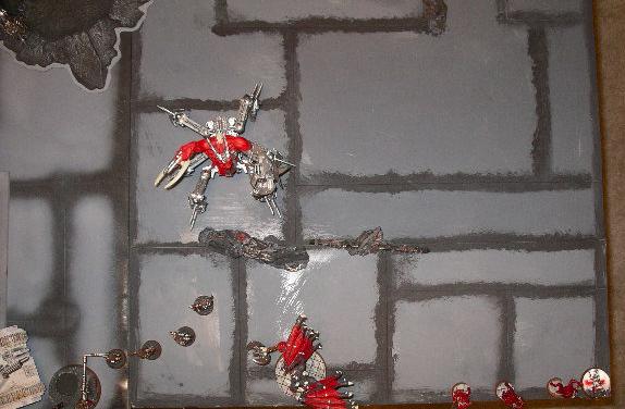 The central bloodcrushers charge the vakyrie and hit it a couple of times despite needing 6s. I get a pen but only succeed in destroying one of the weapons to Shep's great relief. The soulgrinder fires a massive glob of acidic phlegm at the vendetta and destroys it. Kel'gran charges the valkyrie in Sheps deployment zone and destroys it but the Elysians just hop and get pinned out on top of the objective from which I am still 5" away. My bloodletters claim my own objective and I cross my fingers. The warbringer charges the final squad of vostroyans on the table and wipes them out.