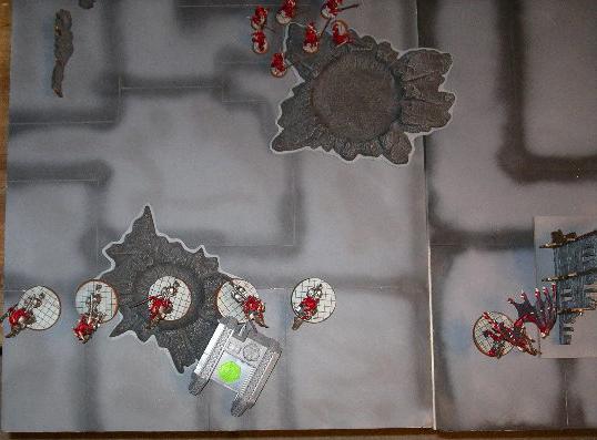 Dawn of War would definitely be helping me here so I decided to press in as hard as I could. I stacked most stuff on the left half of the table and run forward. The Daemon Prince comes on near a building in the center of his deployment zone to try and hug a little cover. The soulgrinder shot at the troops and might have killed a couple, but not much else.