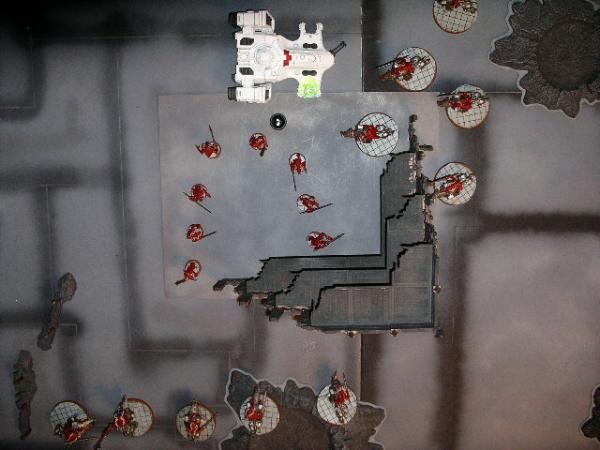 The full unit of bloodletters is out of charge range and runs to hug the left table edge and spreads out in a line to protect from pie plates. The 3 bloodletters are in charge range of two different units and do a dual charge, killing 5 guardsmen but losing 2 of their own, it is enough to keep them from shooting next turn. The daemon prince charges through the building at the senior commanders chimera and destroys it. Kel'gran flies over and charges the infantry squad the soulgrinder had targeted last turn and kills all but one who, quite sensibly, breaks.