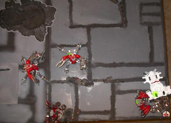 Kel'gran moves toward the valkyries and the Warbringer charges the immobilized chimera, destroying it. The remaining soulgrinder destroys the platoon command squad with shooting and consolidates with its front armor toward the vendetta. The second unit of bloodcrushers starts running toward my home objective to provide cover for the scoring unit. There isn't much