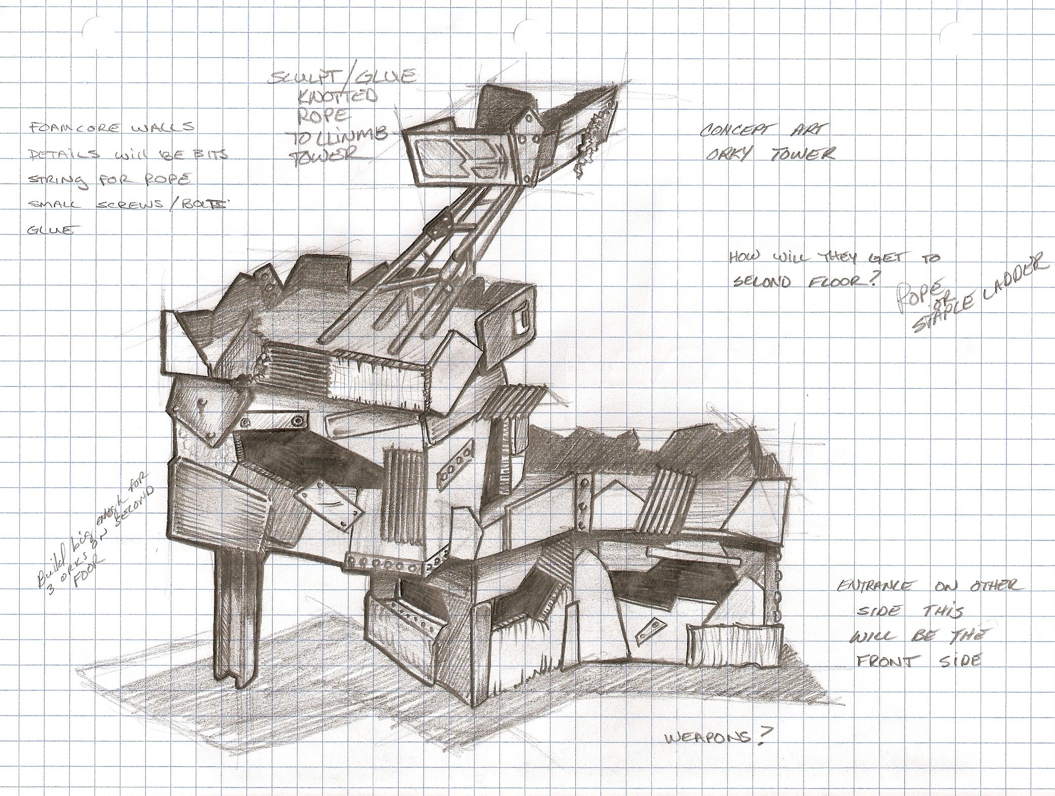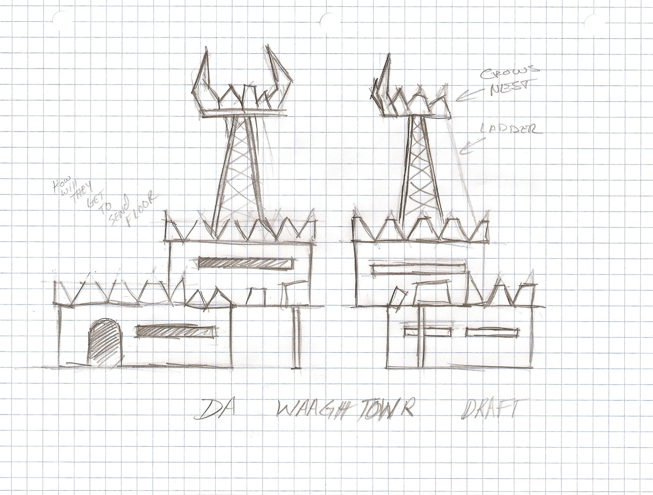 I was stuck in a lengthy meeting, where only about every twenty minutes or so actually contained information that was actually credible and interesting, so I sketched out what I thought would be a cool Ork watch tower.