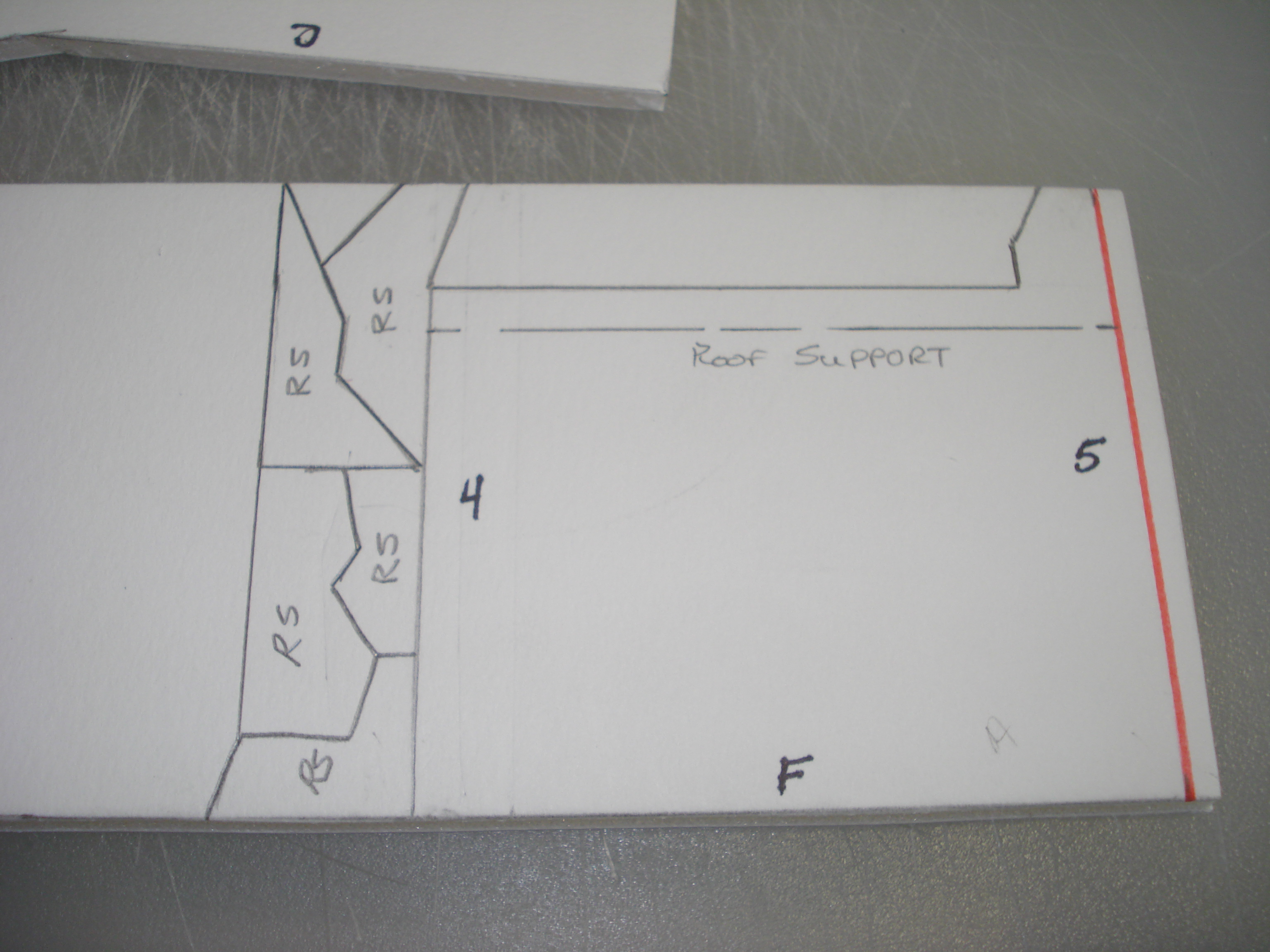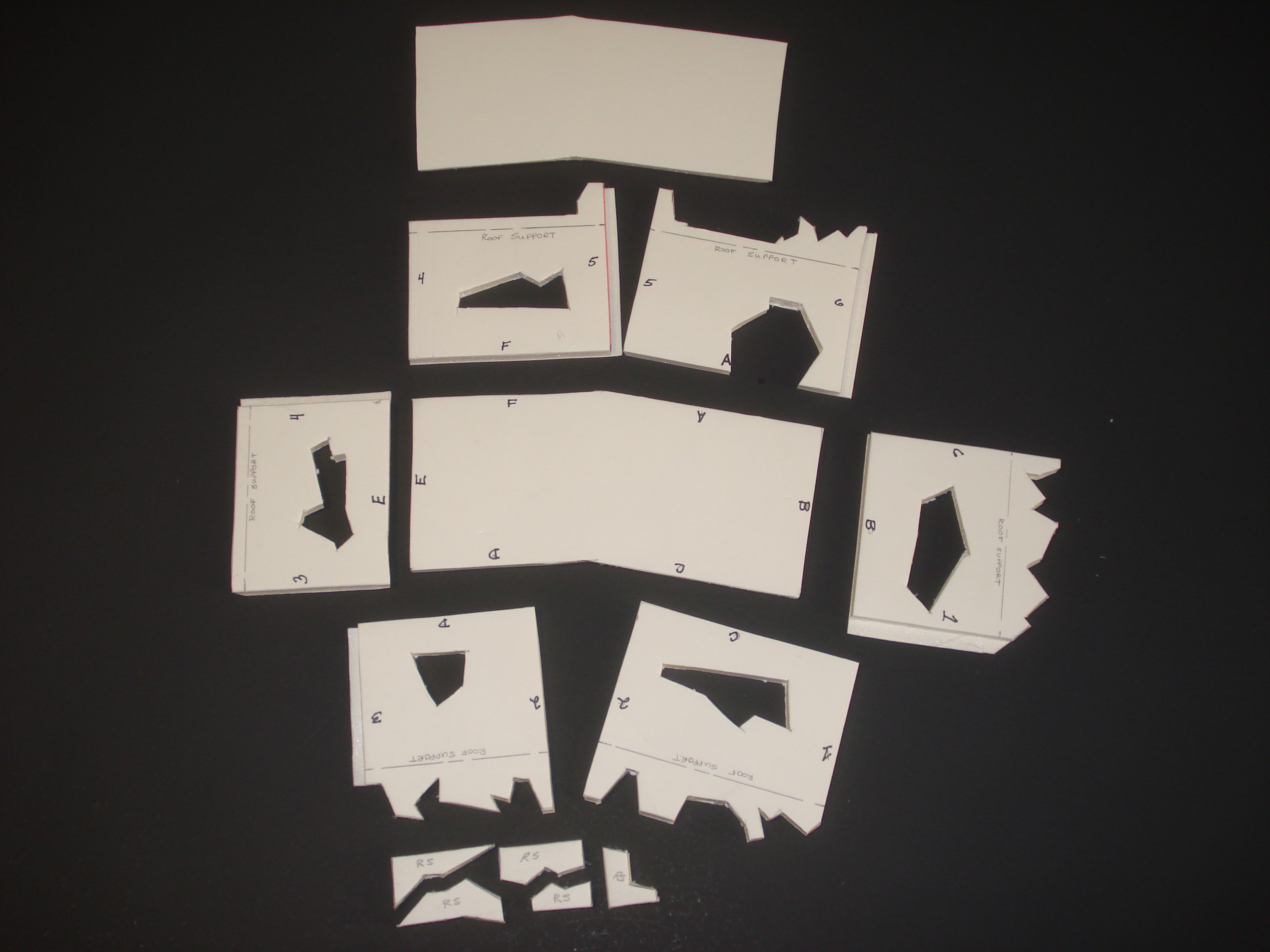 Starting with the floor, I slowly start drawing out my pieces. The floor will have some strange angles, and will also be duplicated in the roof, so I will have to carefully lay it out once and cut it cleanly.