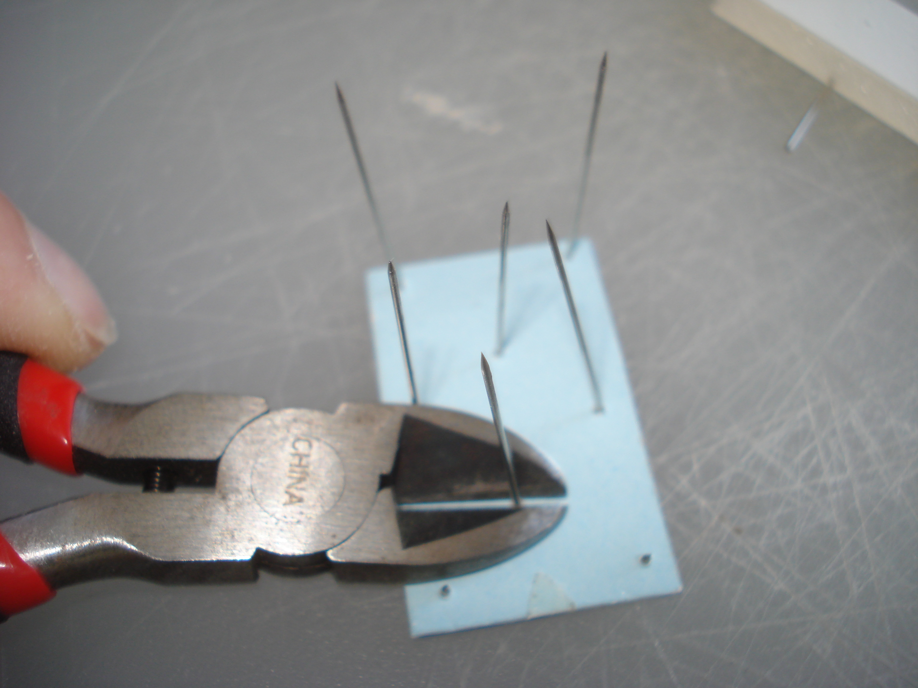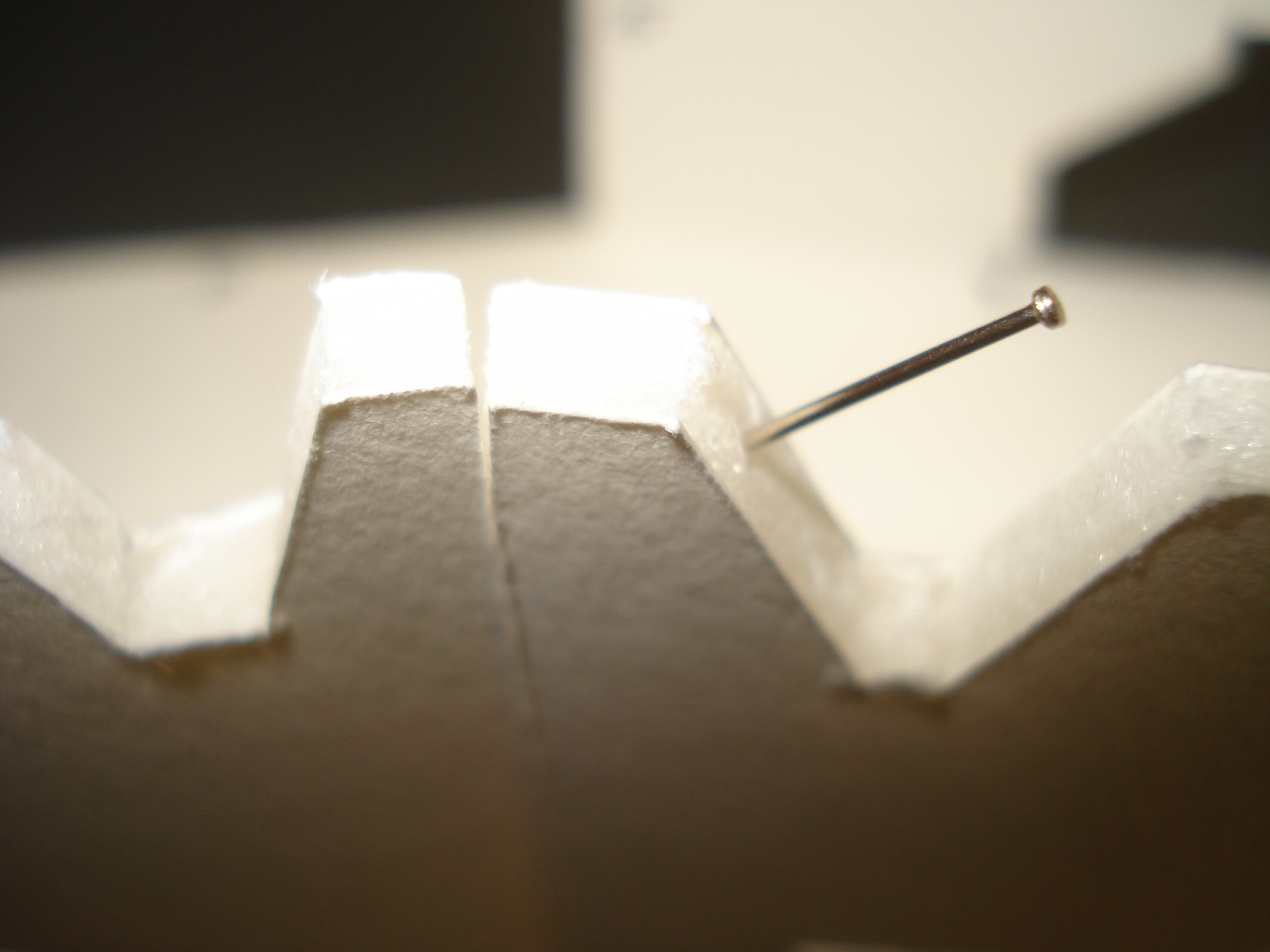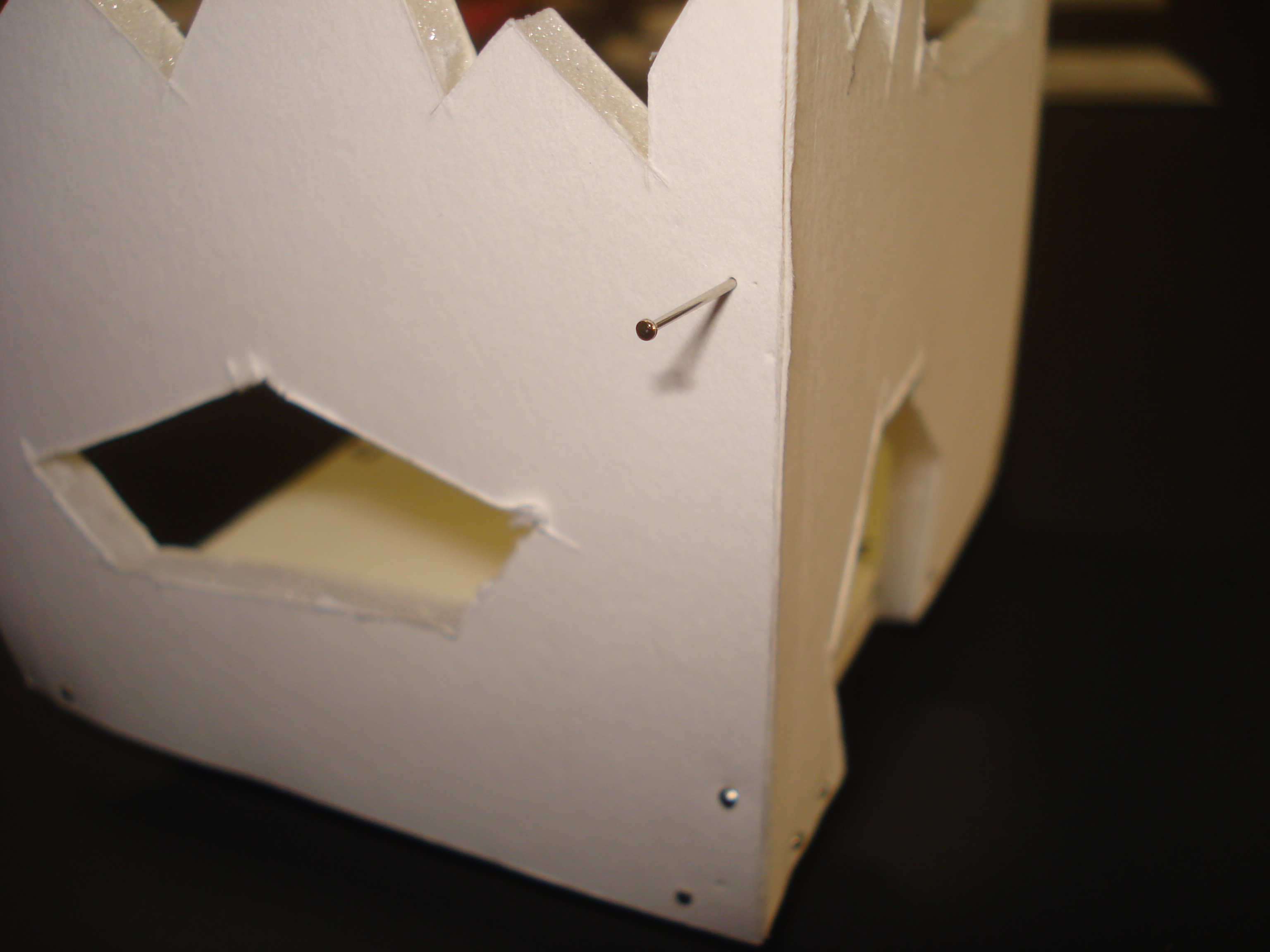 Push the straight pins into the wall, and through into the floor, and wipe off any excess glue. The straight pins will add strength to the model, as well as hold the walls in place while you move to the next piece.