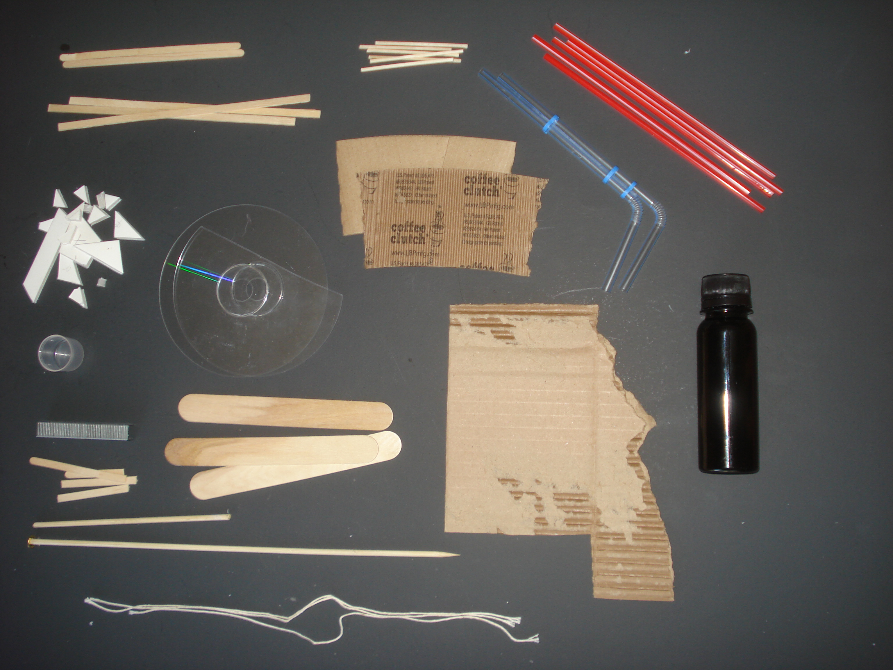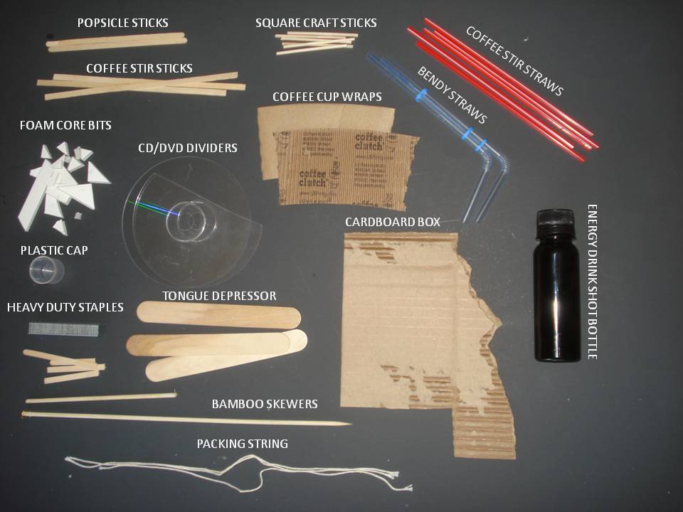 Some of the items that I found were straws, extra bits of foam-core, a plastic clear CD dividers, industrial staples (for a staple gun I have in the tool box), wire, and bamboo barbeque skewers (I love to grill, so I might have to go easy on these).