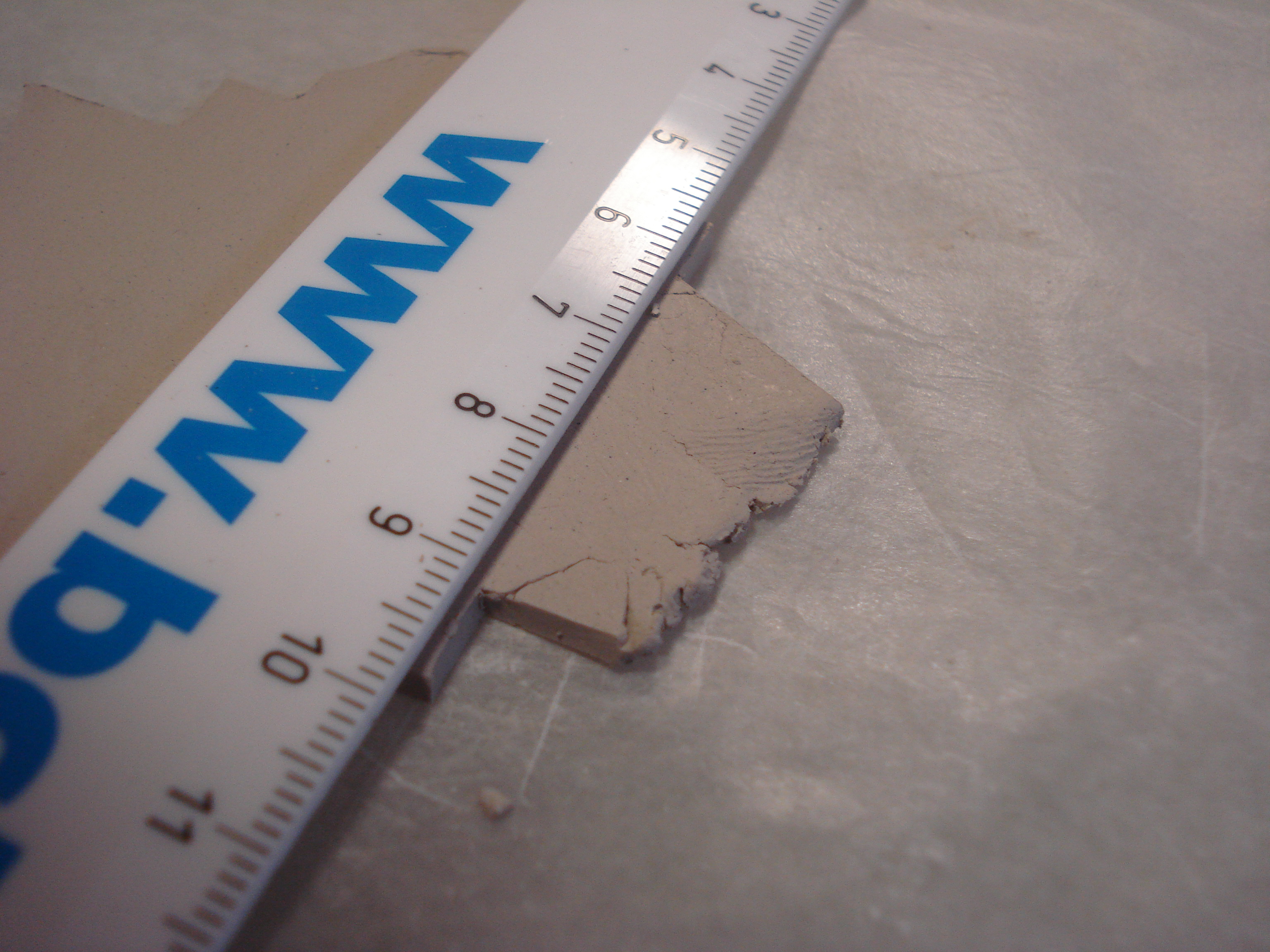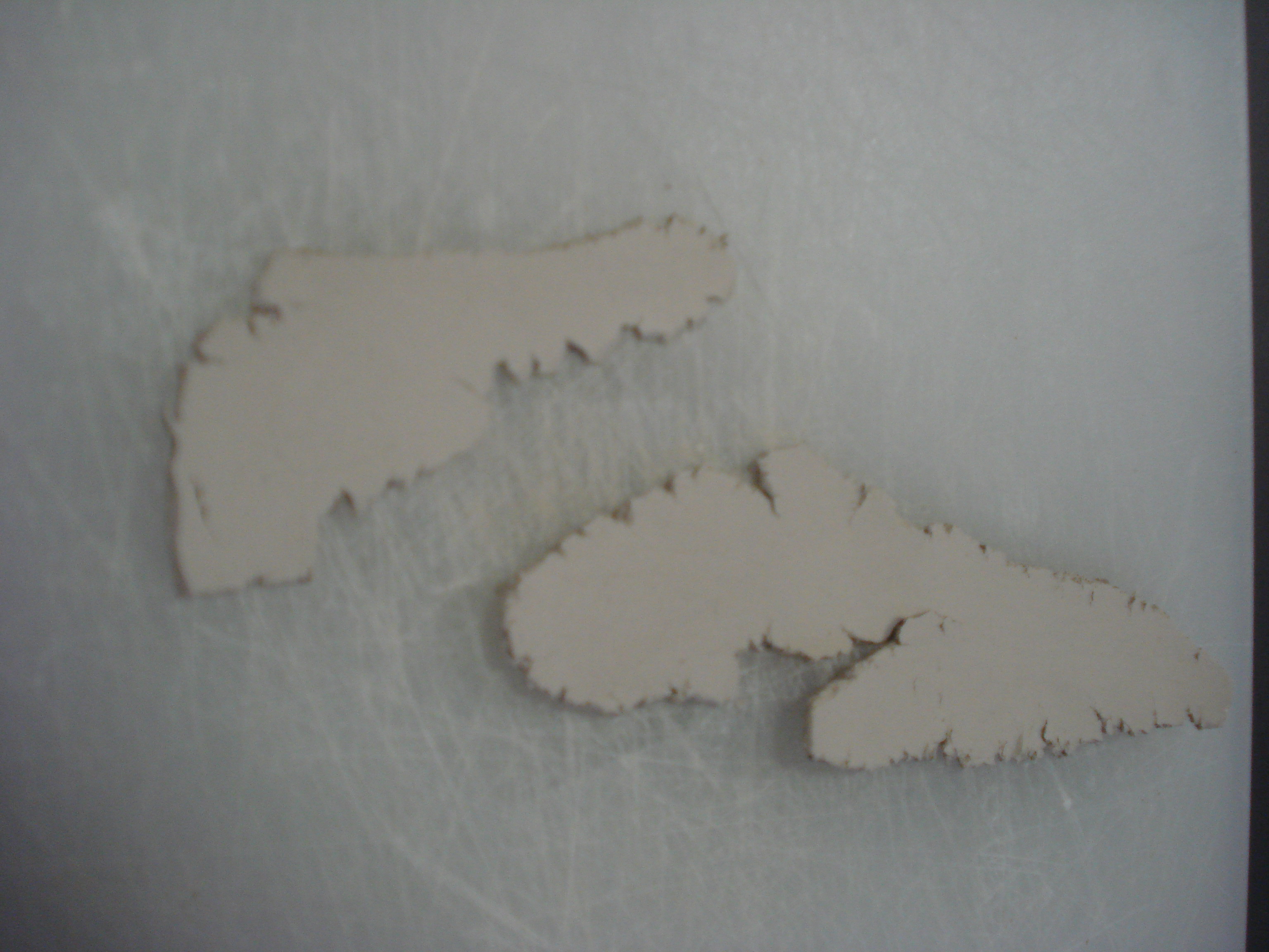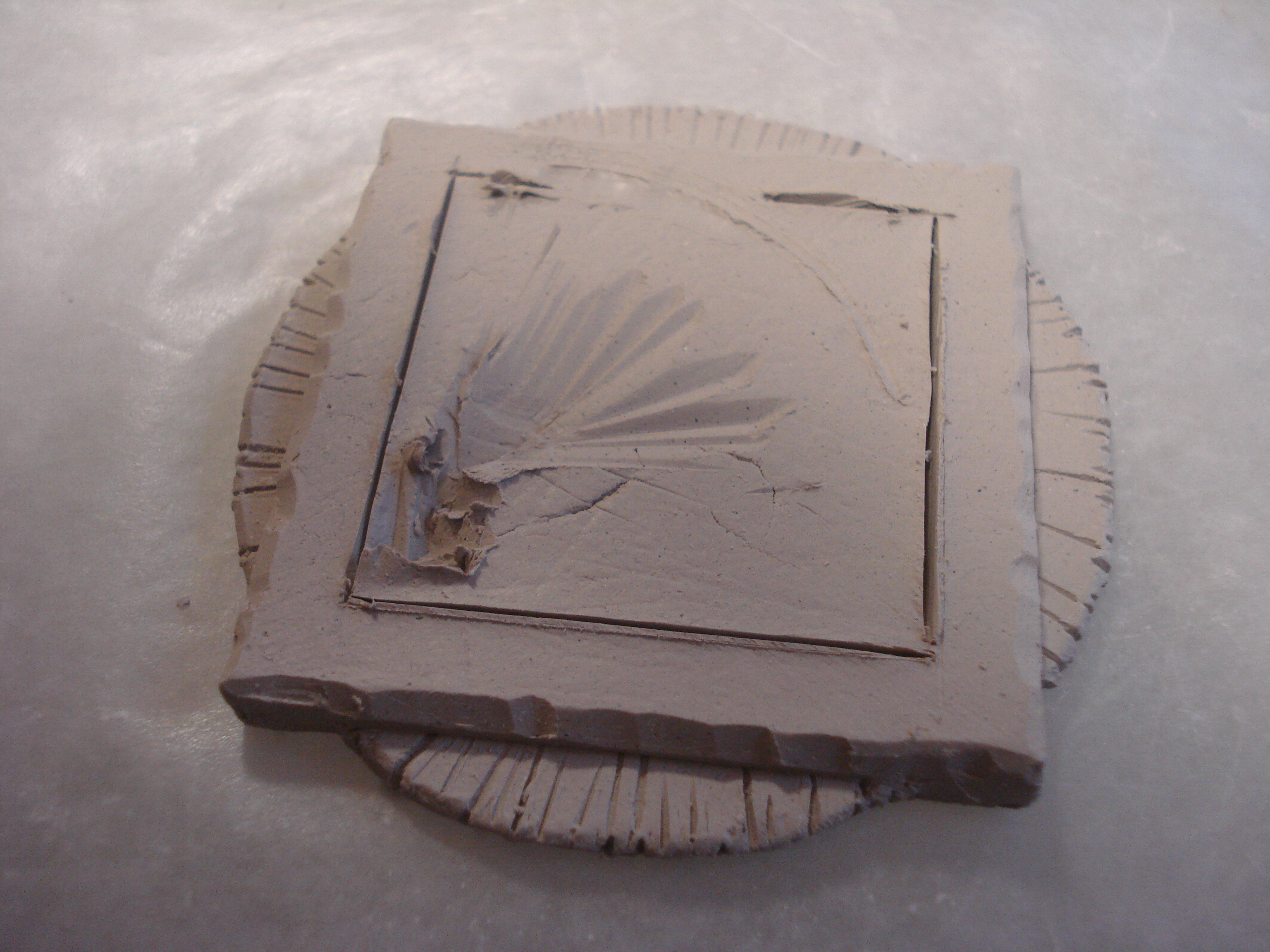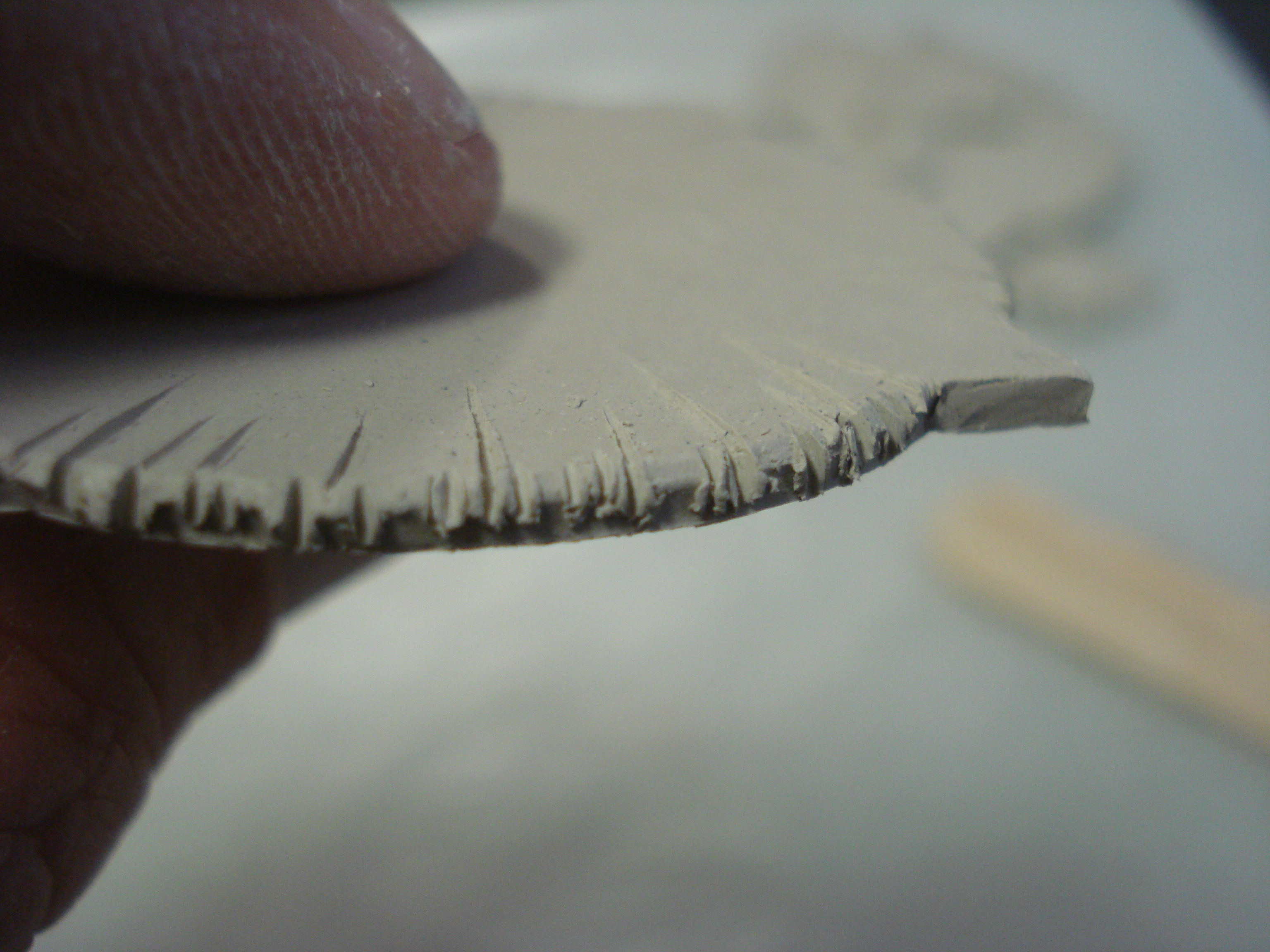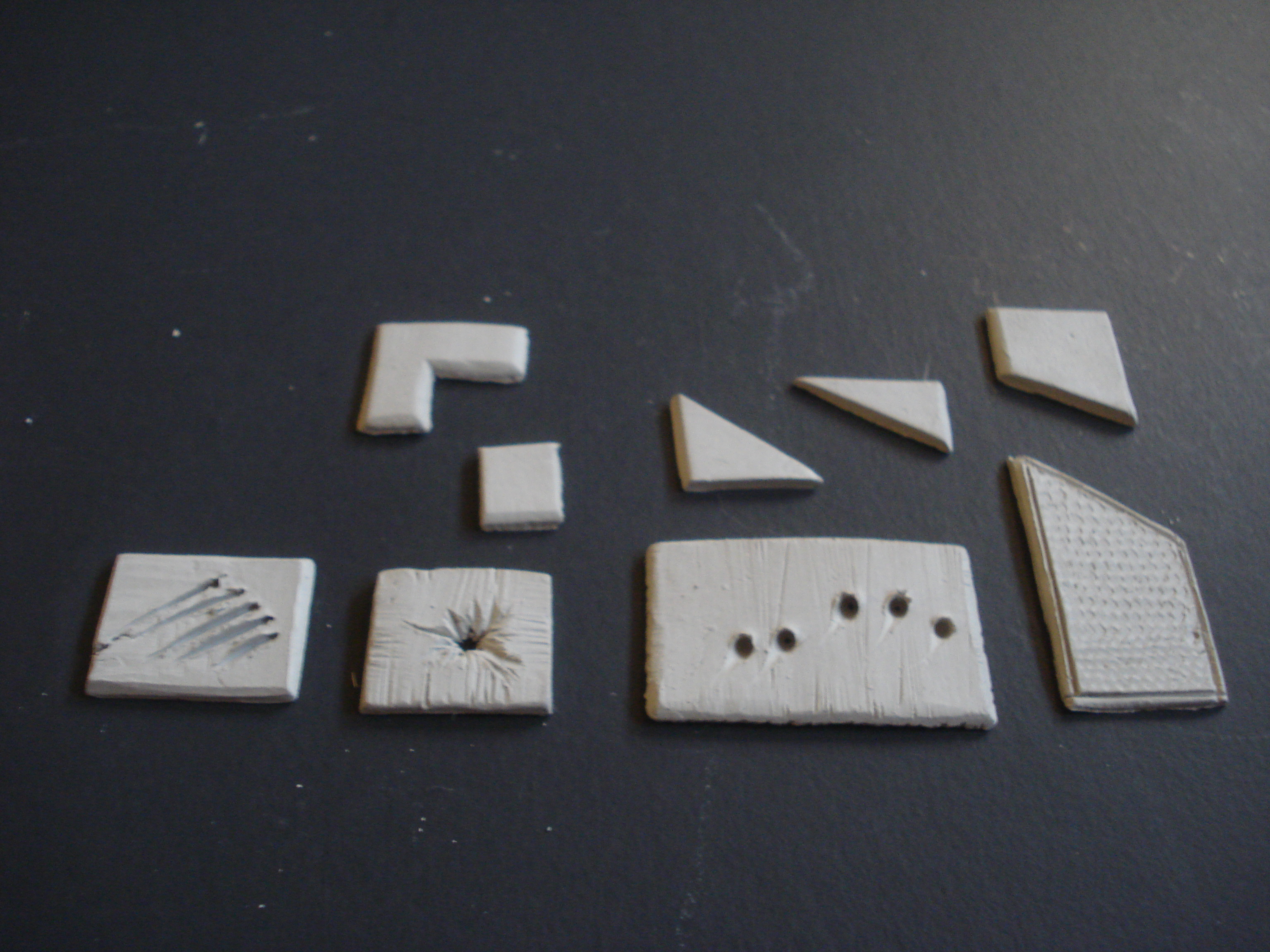 I also used a tongue depressor that I cut and sanded to an “Exact-O Blade” to straighten up the straight edges, and a quick drag along the clay to make gouges and ripples. The same tongue depressor, tapped on the edge fast and light will make torch cutting marks, while a soft tap on the edge will leave a small groove from the edge of a blade.