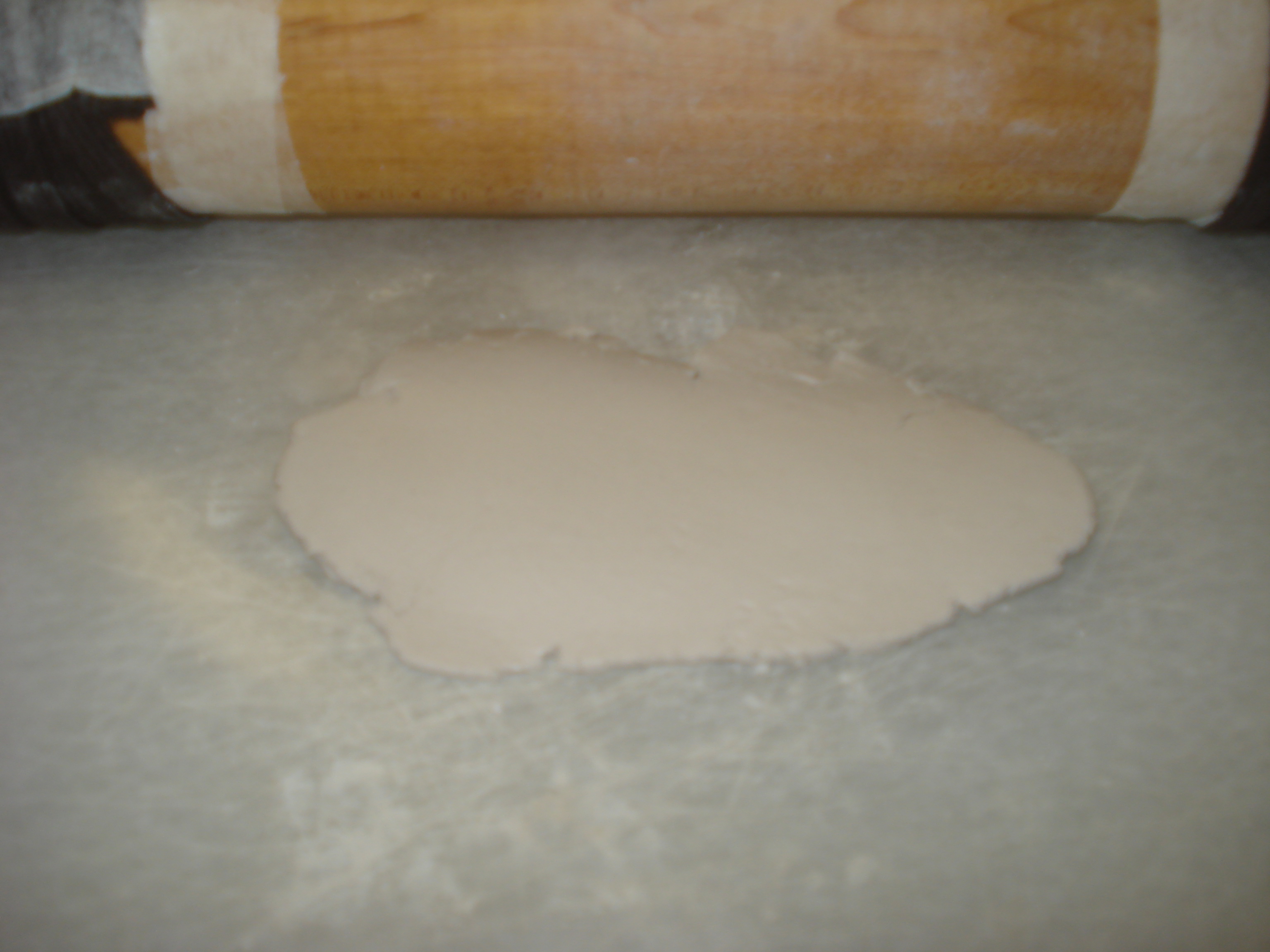 Okay, here you can see that I have started rolling out the clay. When you do this you want to do it in small amounts. Do not try and do squish it down all in the first go, 1/8 to 1/16 of inch at a time, and I will do it up and down (vertical) and then left to right (horizontal).