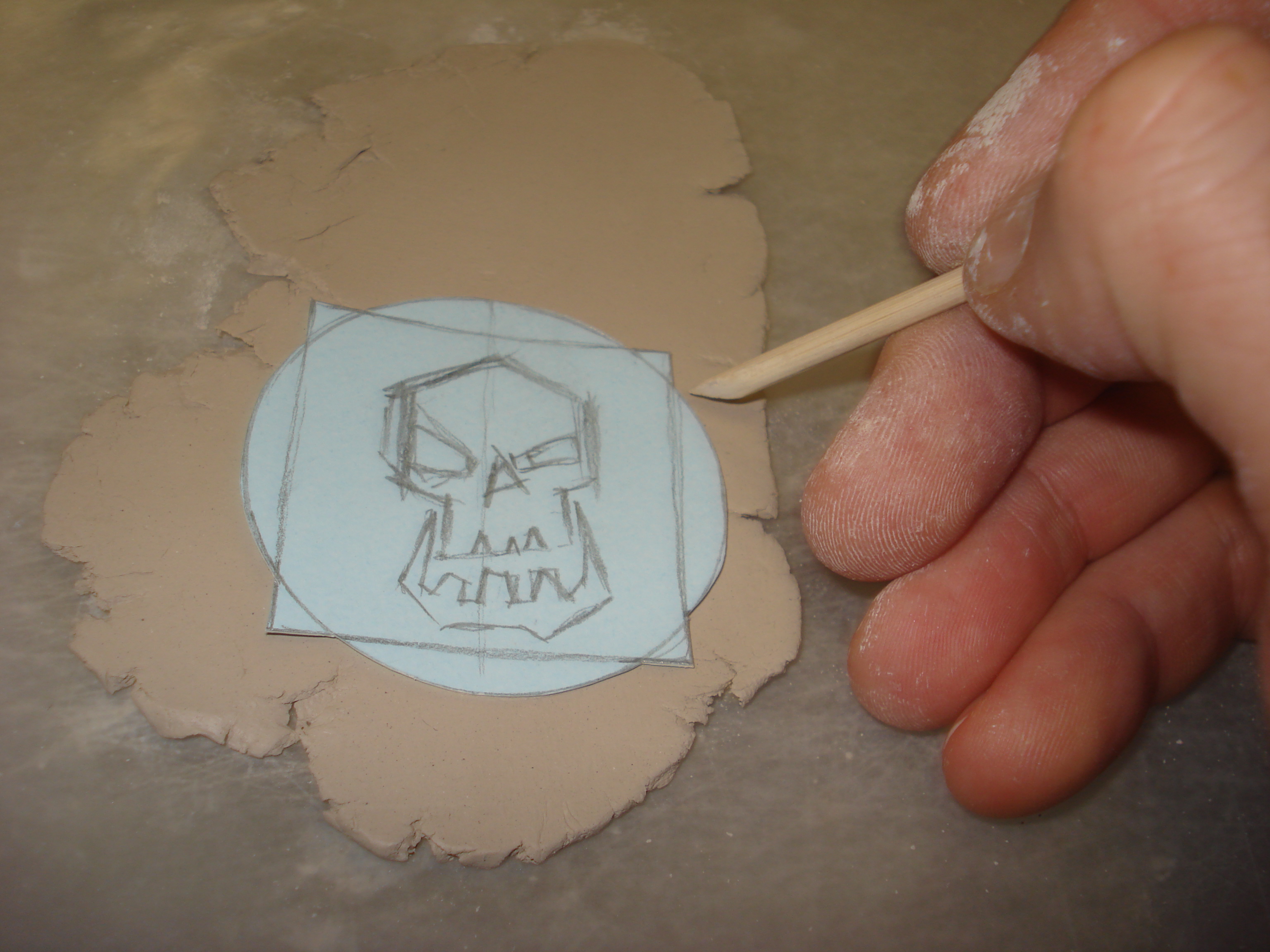 After that was all completed, I started in on the skull. I used the same method as above, only this time I pressed the clay onto the template and cut away the excess slowly to reveal my lines.