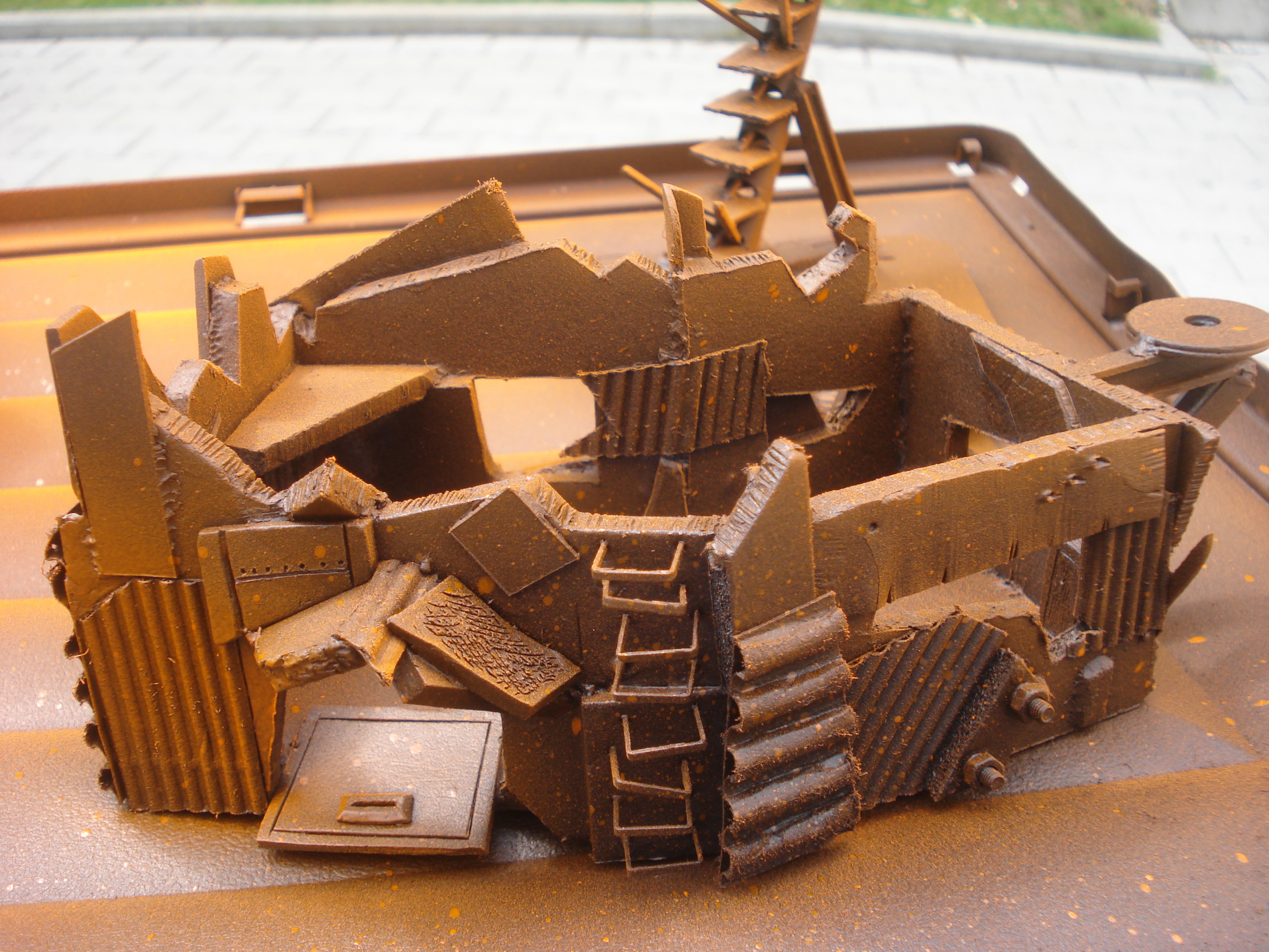 Now that the entire model looks like a rusted box of scrap metal…it is time to make it look like a Orc-made rusted box of scrap metal”.