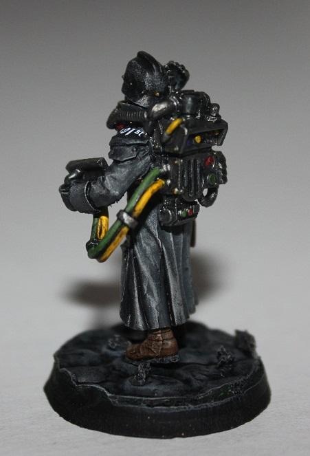 After that I paint all the armor bits (helm, shoulder pads, gun, etc) black and then dry brush a light grey (forgetting the name right now, I'll check when I get home). After that I go about painting the boots, backpack, and harness a brown color and I'll do a quick highlight with a lighter brown. I paint some boltgun metal on some places such as the breathing tube and parts of the lasgun and then do some odds and end cleaning up and painting some of the lights in the breather units on their chests if they are showing. Then I use Didi's Magic Ink wash over all the models. This does three things, it REALLY lessens the dry brushing (you'd be surprised at how obvious the dry brushing is before this step), defines all the details on the model better by making the recesses dark, and does a good job at hiding any slight imperfections in my painting.