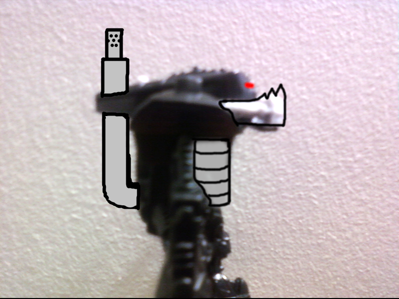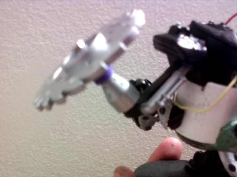 Replace the left arm with a buzz saw I found on a Robot Wars toy at Walgreens.