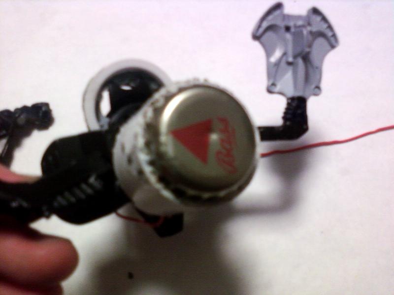 I glued a beer bottle cap to the under side of the kan part of the torso.