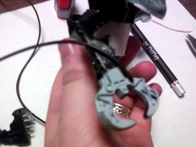 Started placing control cables for the claw. You can see that I have placed some spiky bitz on the left foot in the bottom left of the pic.