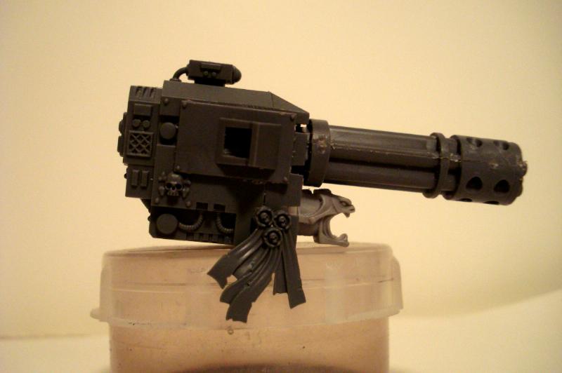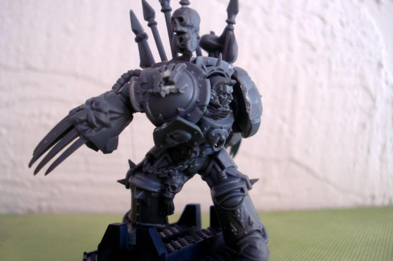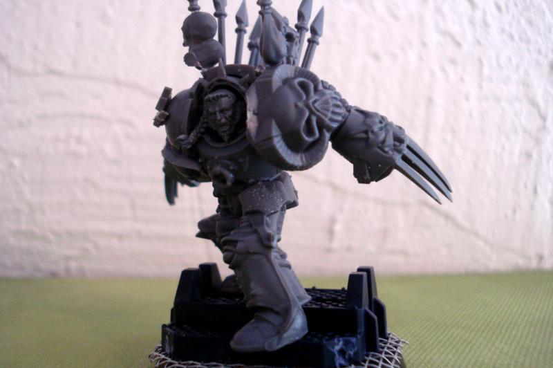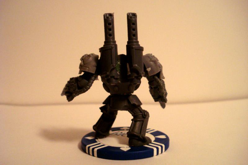 Here is another update on my WIP. This is my second dreadnought. I have a lot of little work to do on him. I plan on having a couple of ammo feeds running off the assault cannons (similar to the SM heavy bolter) running to the "back pack". Also intend to add something under the left leg to show it striding over or stomping on. Let me know what you think.