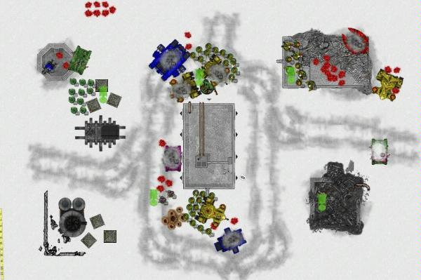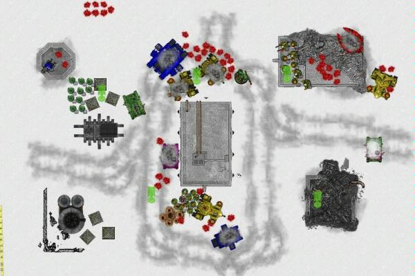 Seize ground, 5 objectives, deployed Pitched Battle. Tau won to go and deploy first. They deployed north for the two story building, and spread out to get maximum coverage. Chaos deployed to play a Bull's Horns game (squize the enemy’s flanks into the body force moving down the center), but prepared change it into a Refused Flank depending on when the reserves showed up. Chaos fails to seize, but then rolls Scout for the Possessed, and I’m tempted to call it game right there. Refused flank ho!
