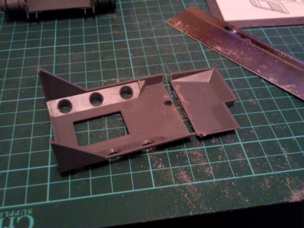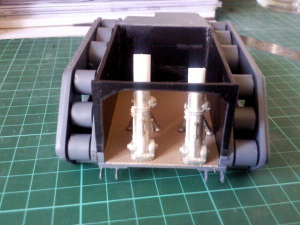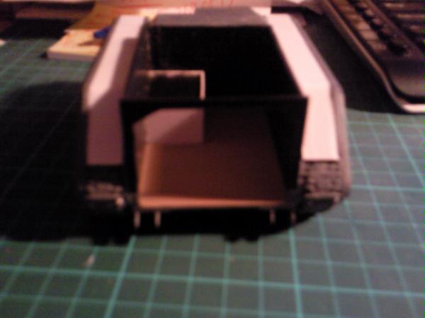 Stage Three - Passenger compartment. I cut rectangular peices of plasticard to form a box around the area where the mortar will be sited, ensuring that they were the same height as the cab bulkhead. and stuck them in place with poly cement.