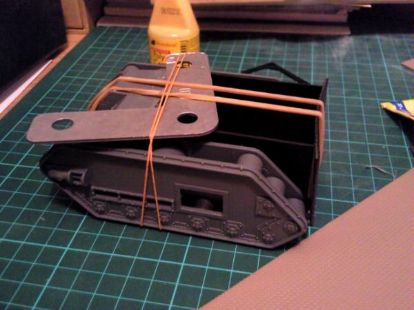 You will note that I glued the forward bulkhead first, then the sides and then finally the rear bulkhead. A little more time spent doing this in stages helps with accuracy I think. I also use a few peices of metal and elastic bands to ensure flush edges and a tight bond.