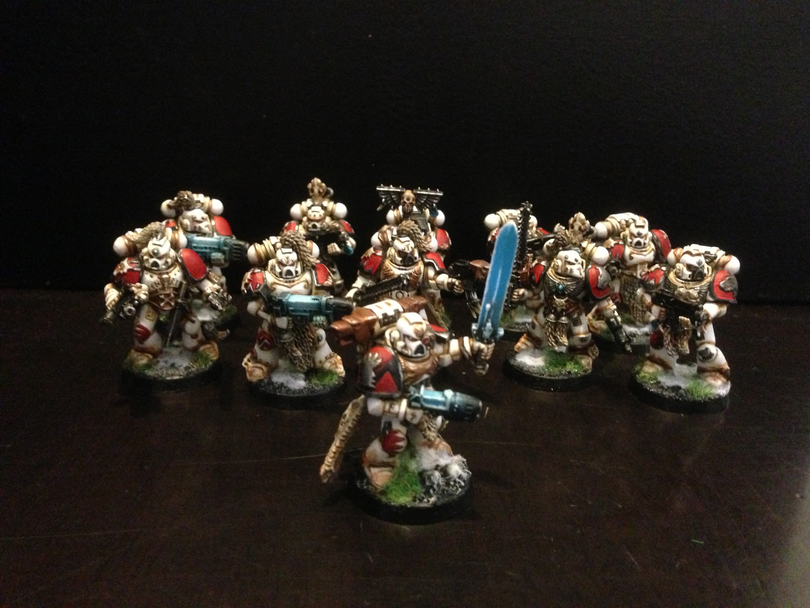 Here is my alternate space wolves paint scheme. Chose a bone/white colour with brass edging.
