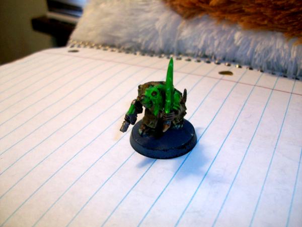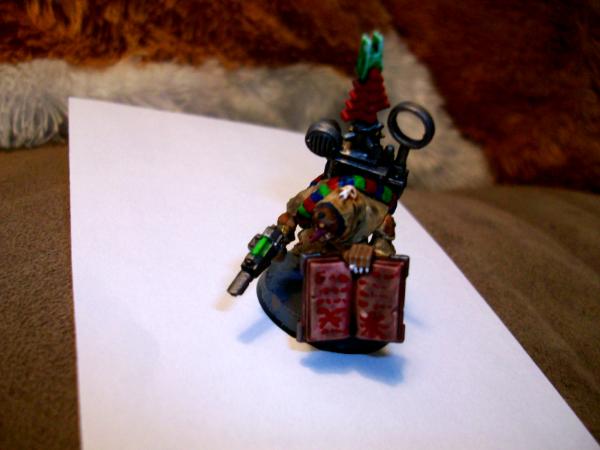 Been an overly long work week  got little to nothing done. Teaching my wife how to play (she is doing amazingly well) and helping the 5 new guys we got at the club get the hang of the game also took a chunk of time out of my limited time. I did manage to get my master of ordnance done. The book I tried to make look like it was inked in blood...didn't quite turn out though. I made a GS "strap" for his vox and ended up putting eyes and fingers on it to make it look like a captured daemon with a poisonous snake paint job...again iffy results, but good enough to make him look special.