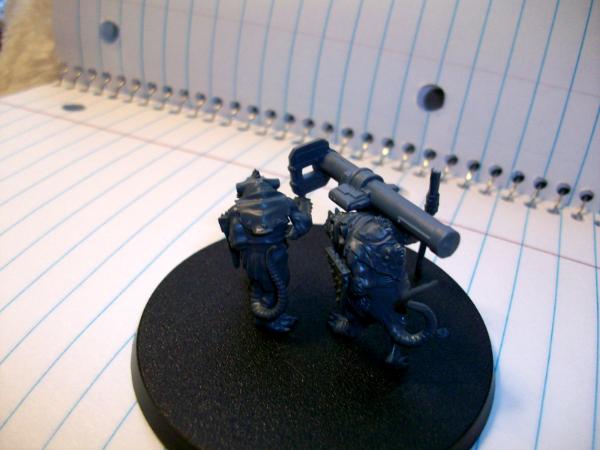 This is one of 3 melta spear guns. This army is my first attempts with green stuff so the parchment around the gun isn't the best but works  The spear is the stormvermin spear with the blade removed, a chopped space wolf bolter, a chopped end of a Cadian flamer, and the wire/hose from an eldar splinter cannon.
